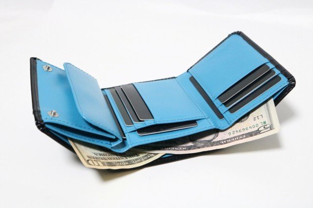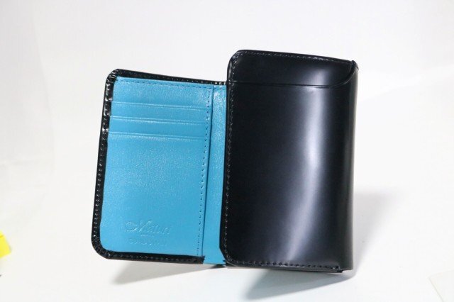 圧倒的人気のコードバン三つ折り財布。 古くから高級道具に使用されてきたコードバンは強靭で耐久性が高く、艶があるのが特徴。その艶は抜群の輝きを放ちます。 使い込めば使い込むほど味が出るので、エイジングを楽しみながら長年愛用することができます。 内側は牛革を使用。三つ折り財布ながらも収納たっぷりに仕上げました。 年齢関係なく愛される三つ折り財布です。 ■カラー:外側/ブラック、内側/ブルー ■サイズ(約):縦12cm×横9.5cm、マチ3cm ※商品によって多少の誤差あります。予めご了承下さい。 ■素材:外側/馬革(コードバン)、内側/牛革 ■仕様:Wスナップボタン開閉、カードポケット×10、札入れ×1、小銭入れ×1 ■付属品:Maturi専用BOX ■新品未使用 | |