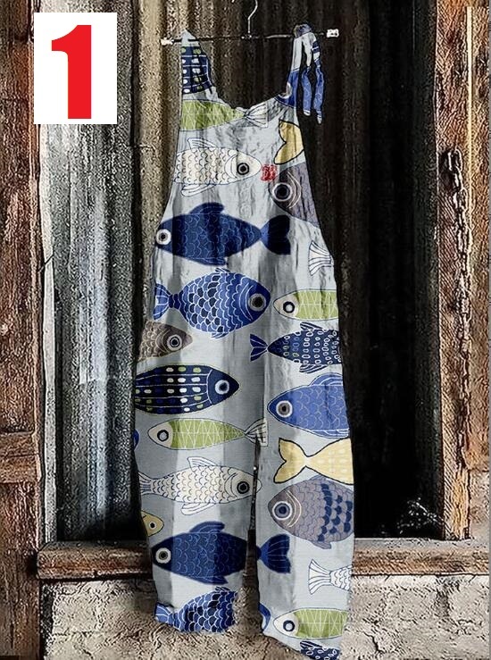 人気品 新品☆着やせお魚柄がかわいいコットン風な素材のサロペット 大きいサイズ ぷっくりパンツがかわいいオーバーオール