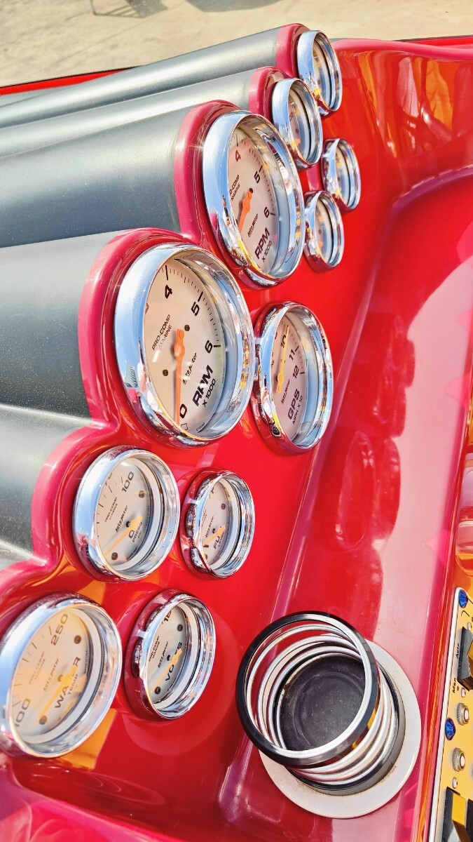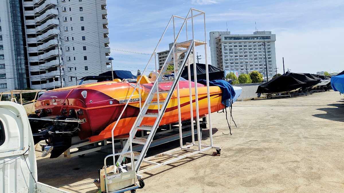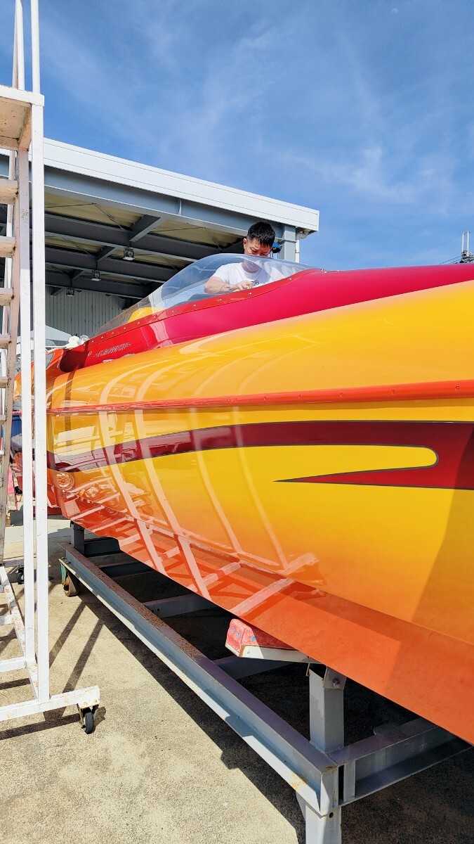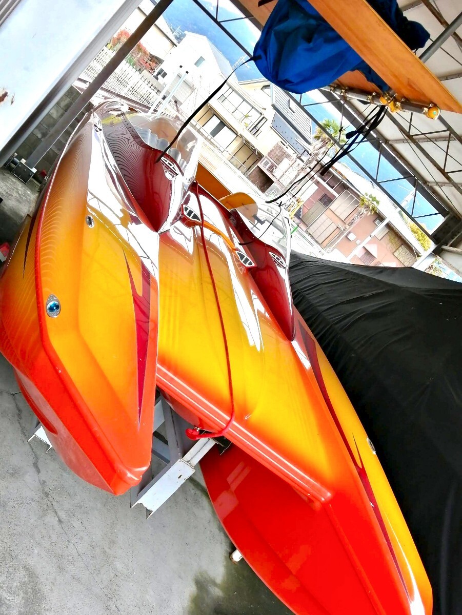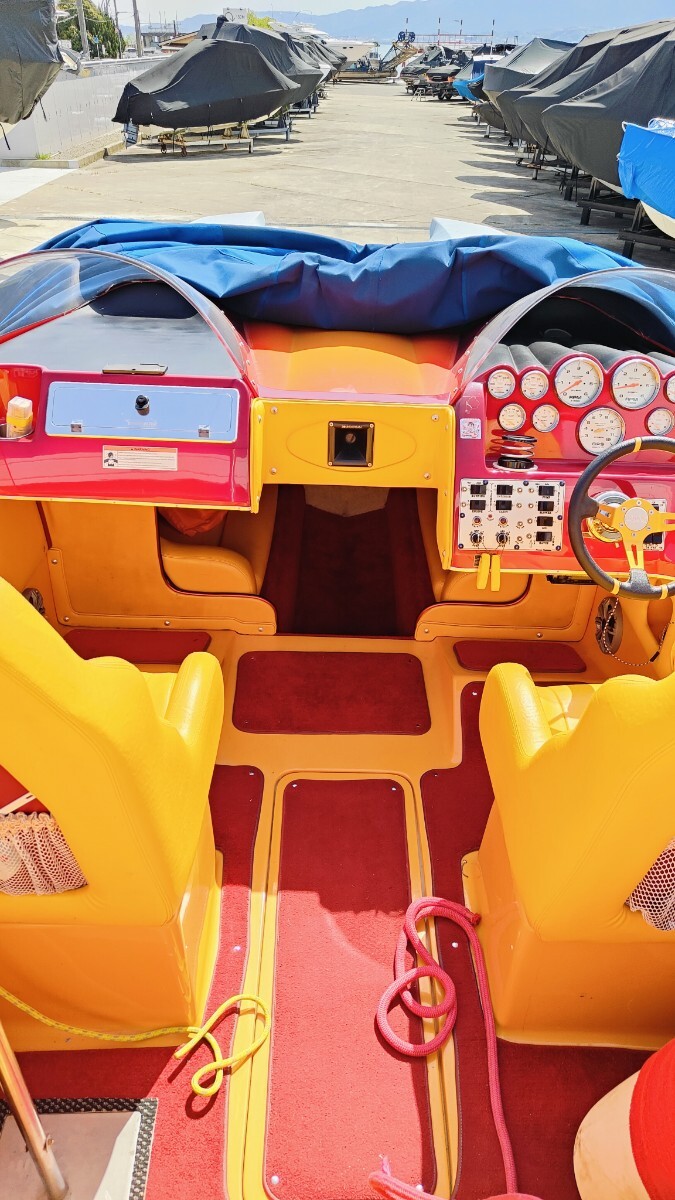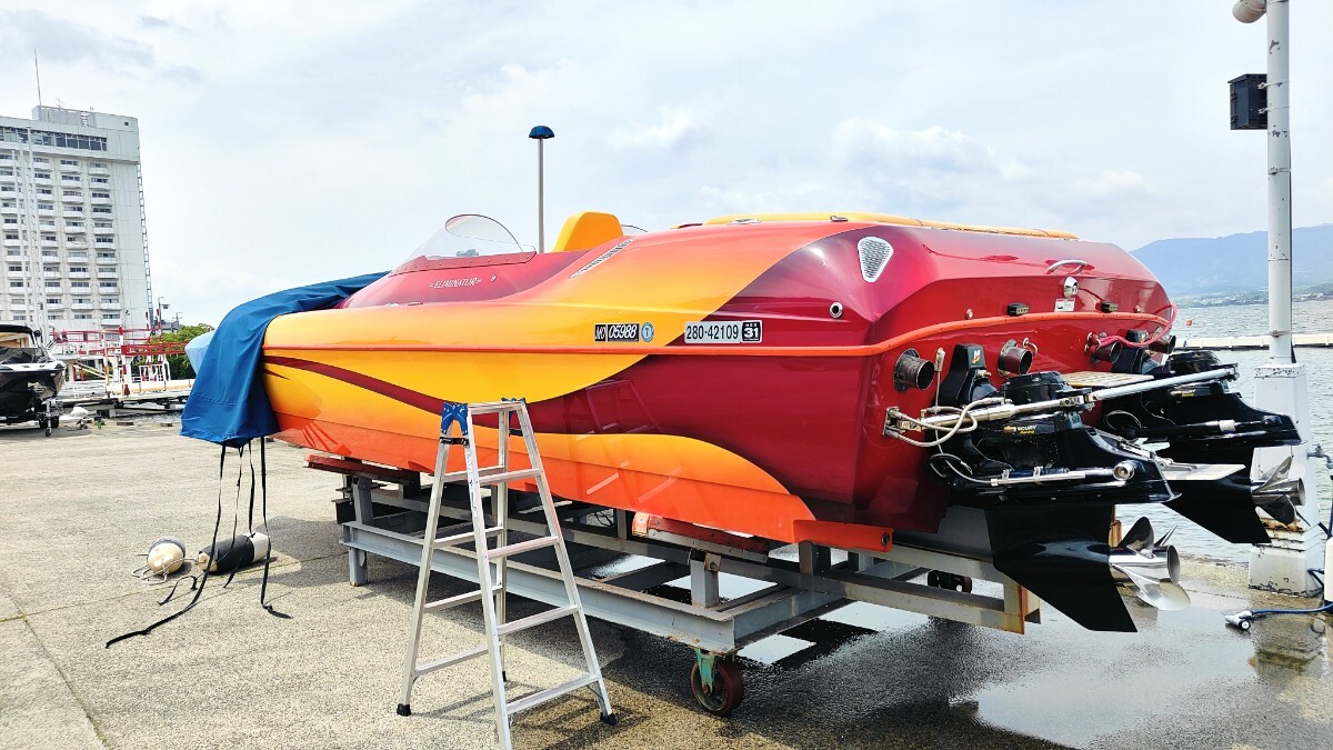 このボートは当時ロスのボートショーに展示されていたボートで気にいった日本のカスタマーが即断で購入され日本に輸入されたボートになります 元々は海での使用でしたが乗り物マニアのオーナーにずっと管理された後売却され琵琶湖へとやって来て今に至るボートになります 2007年式28デイトナでこのボディーにはシングルモーターもありますがこれはツインモーターでトールボディ標準で496ho425馬力がツインで装着されます エリミネーターを良く知ってる方なら28デイトナがツインモーター850馬力で90マイル出るのも解っており人気のモデルになります 良く質問されますが同じパワーなら軽く小さいボートの方が速いです 大きな重いボートは立ち上がりも遅くエンジン、ドライブにも負担を与えます そして速さを求めるならVハルよりカタマラン、トリマランと水に接する面積が少ない方が抵抗が少なくなり速くなります 元々の輸入オーナーは僕も知ってる方ですが途中のオーナー、琵琶湖ですがその時は僕は管理していません 良く知るメカニックの方が管理されてましたが内容は不明です うちに来てツーシーズンで消耗品は勿論交換しておりトラブルは今のところありません 1つ直した方が良いのはエキゾーストのシャッターが片方ボケていてカタカタ言います シーズンオフにでも変えるか抜くか考えてます 間接冷却の496hoは結構強いエンジンでドライブも定番ブラボーにレザム、タイバー 楽しく140㌔で遊べます 定員は8で取ってたと思いますが後ほどアップします キャビン内対面シート ベットも一応有ります この様なボートですが他にも出品してるボート同様に興味のある方如何ですか