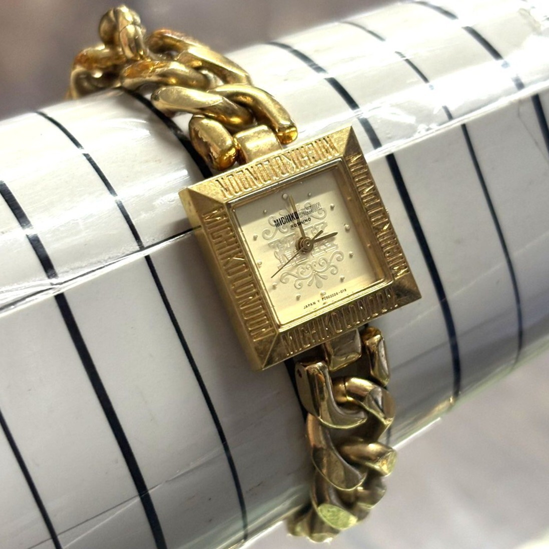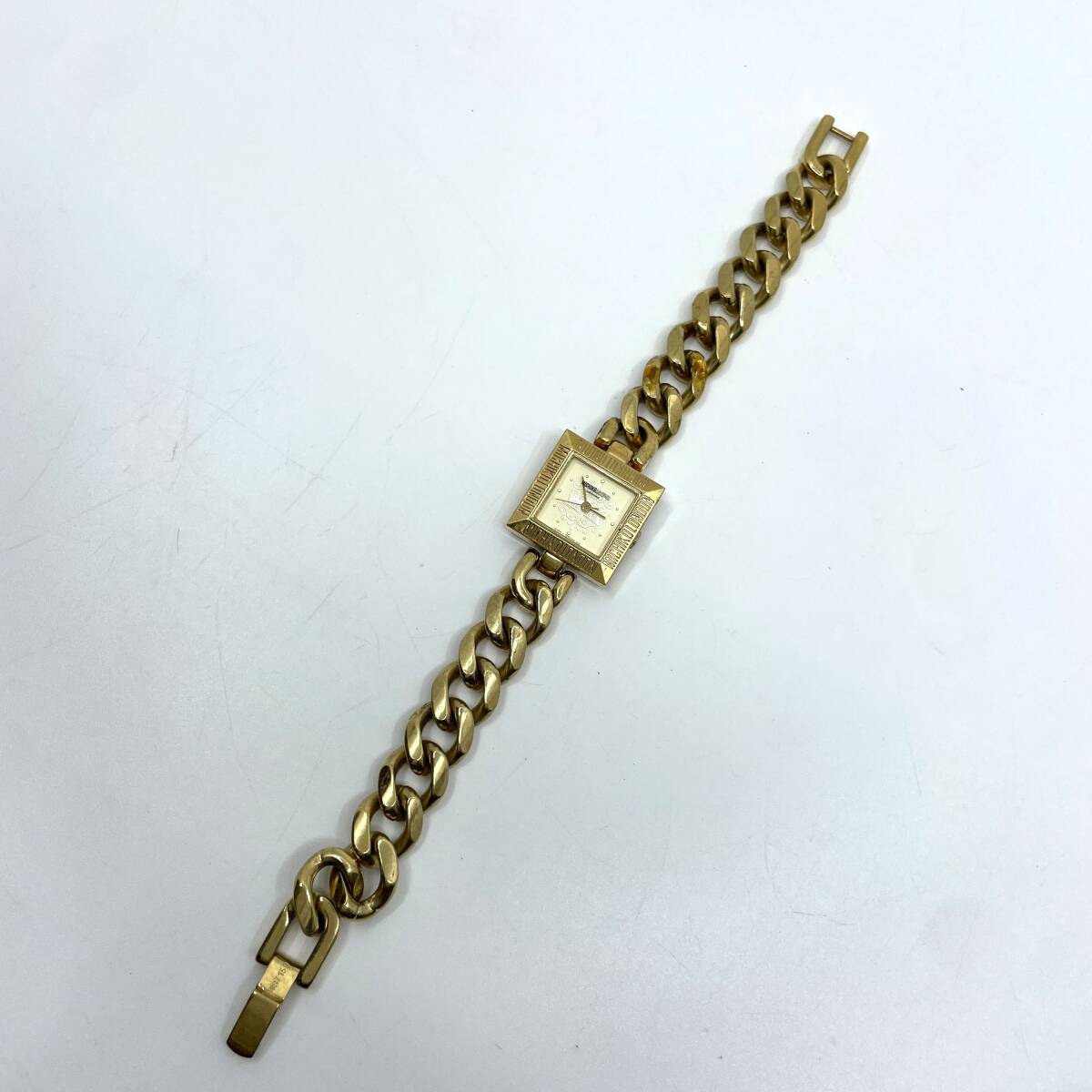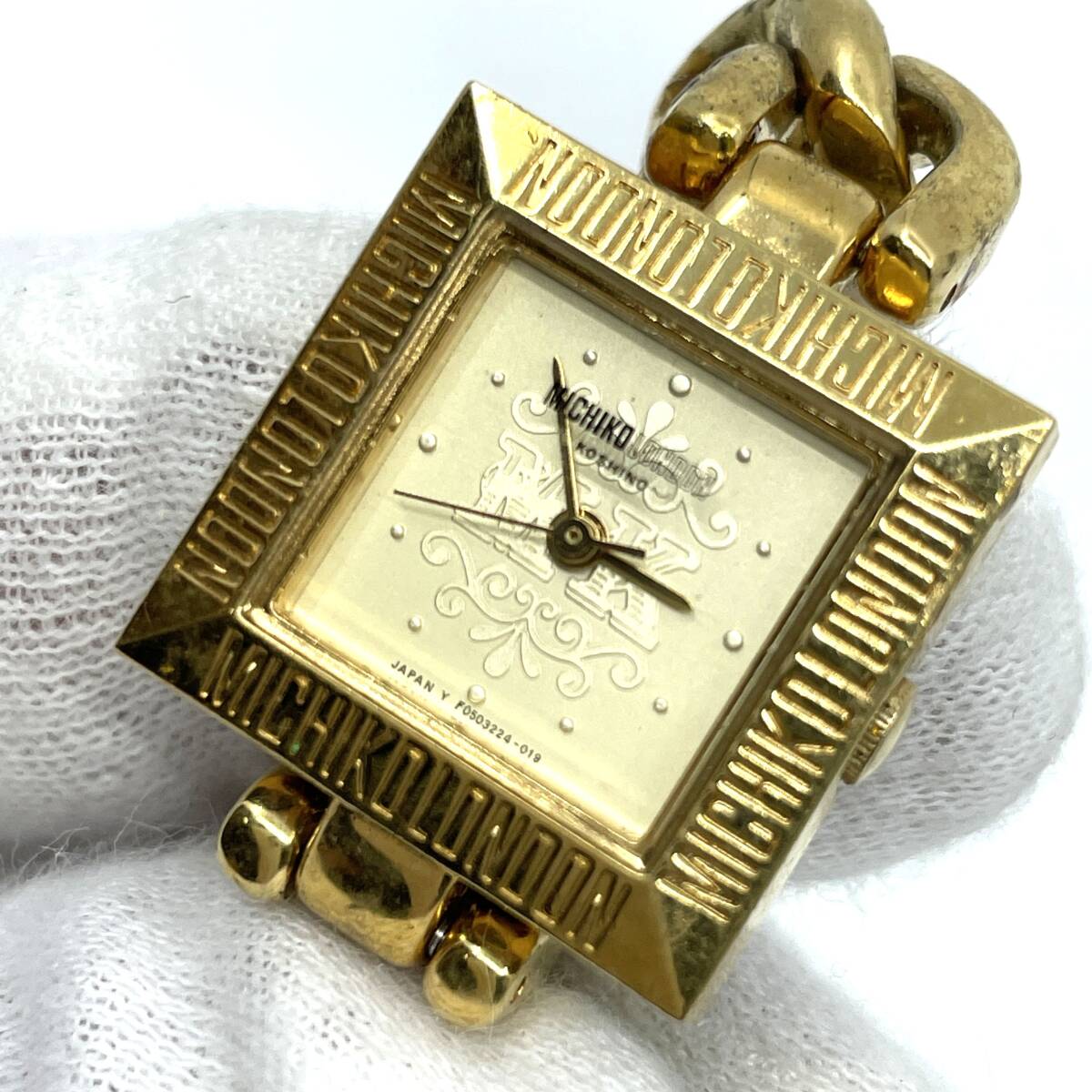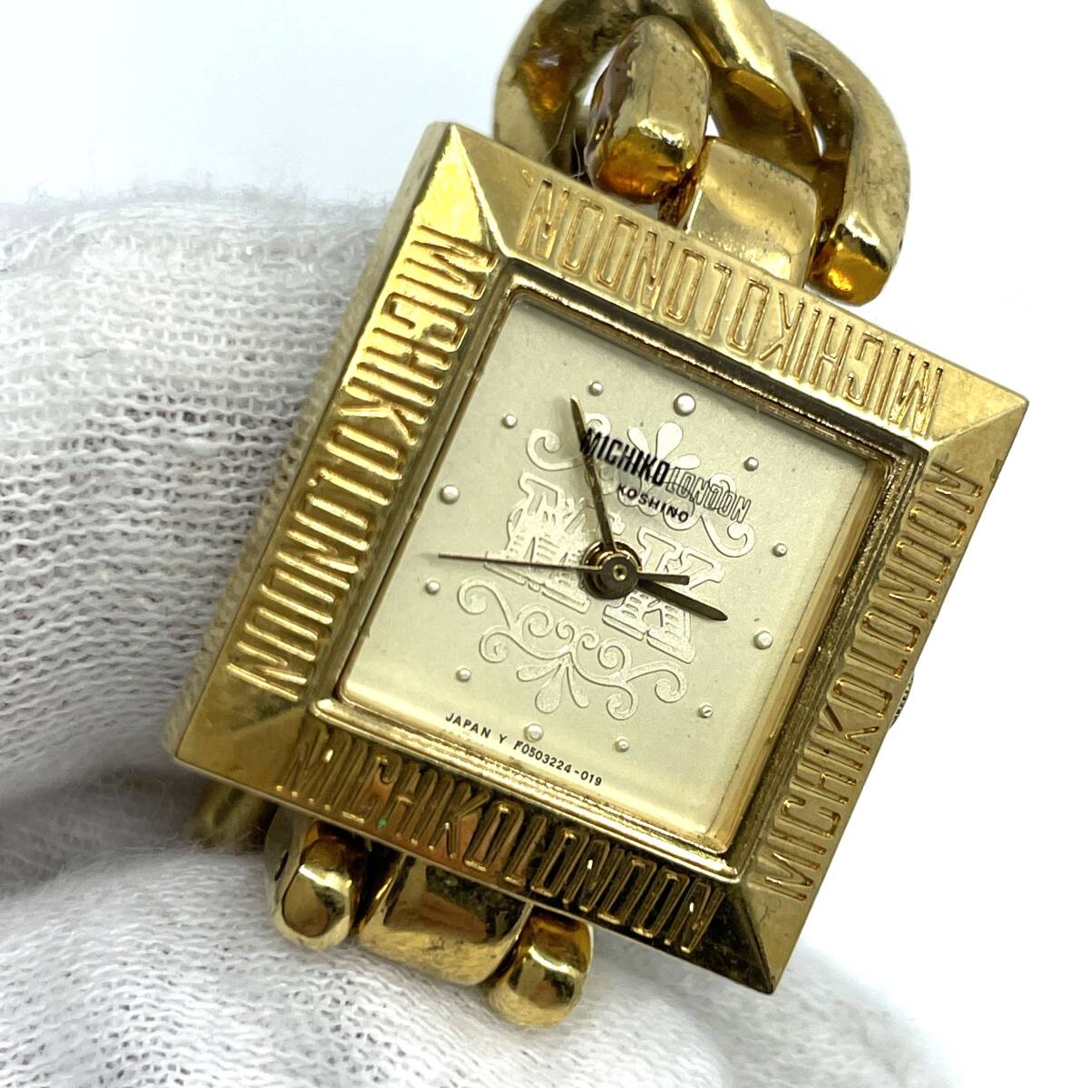 【動作未確認】MICHIKO LONDON ミチコ ロンドン クォーツ 腕時計 ゴールド文字盤 3針 スクエア 喜平風 チェーンブレスレット F05522-41