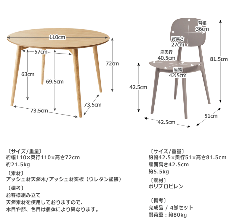 テーブル:約幅110×奥行110×高さ72cm / 約21.5kg