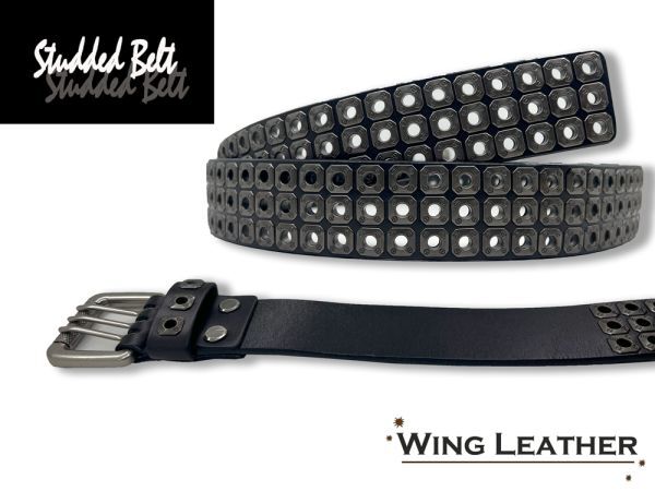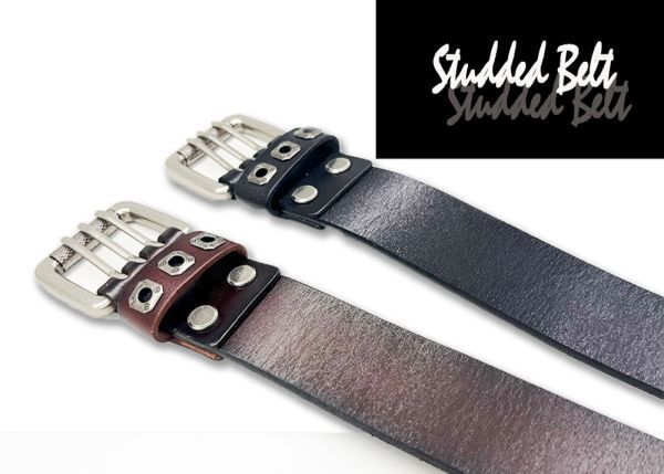 新品 ベルト メンズ 本革 牛革 スタッズ ロック バンド パンク ハードロック トリプルピン バックル 黒色 ブラック cnk041-BLACK