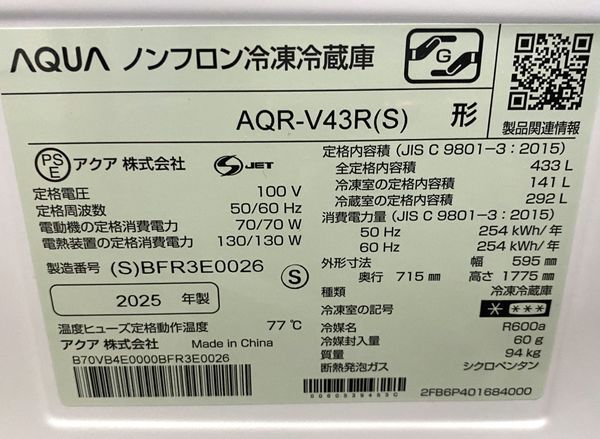 高年式!2025年製! ほぼ未使用 AQUA/アクア 4ドア 冷蔵冷凍庫 433L 右開き AQR-V43R(S) 大容量冷凍室 中古家電 店頭引取歓迎 uR9989