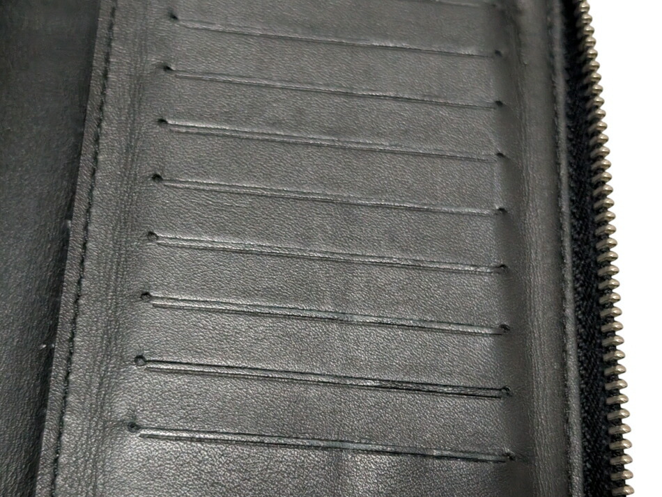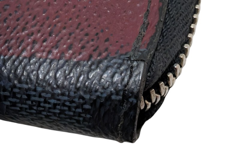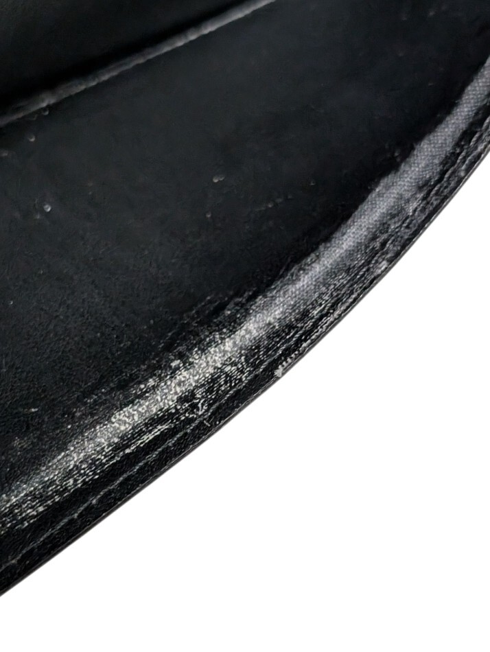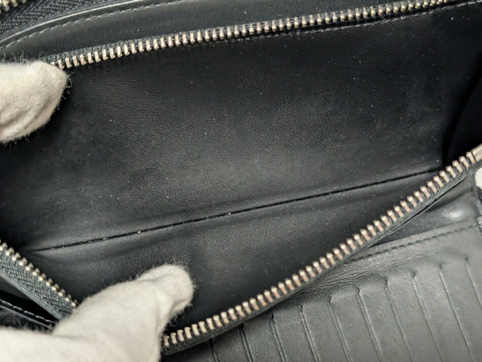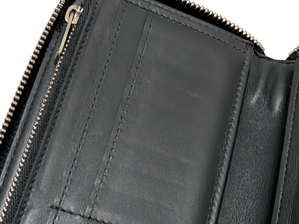 状態・・・ファスナー金具にスレや小傷箇所があります。スパイン部(折れ曲がる箇所の縁部)にスレ、微細な亀裂箇所があります。内部のセンター付近レザーにシワ、カードポケットに収納跡があり反対面にカードの押し跡があります。コインケース内部に薄汚れ。内部のメインポケットの開口部付近にスレ、剥がれ、底部に中素材の剥がれ箇所(ベタつきはないので使用に問題はありません)があります。外見上に目立ったダメージや汚れ箇所はありません。