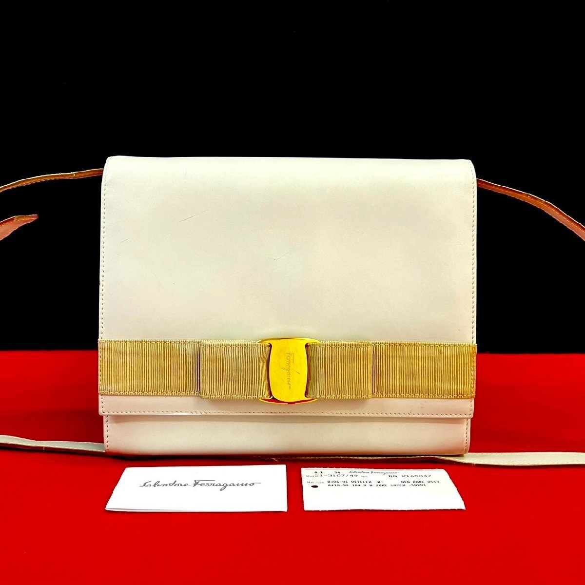極 美品 Salvatore Ferragamo サルヴァトーレフェラガモ ヴァラリボン ロゴ 金具 レザー ショルダーバッグ ポシェット アイボリー 25193