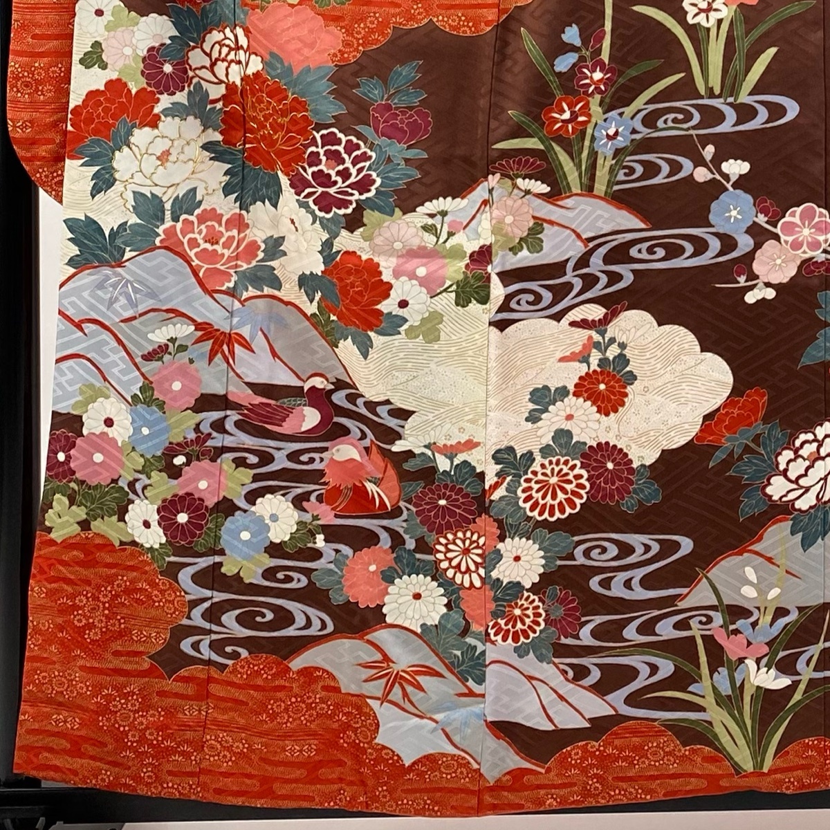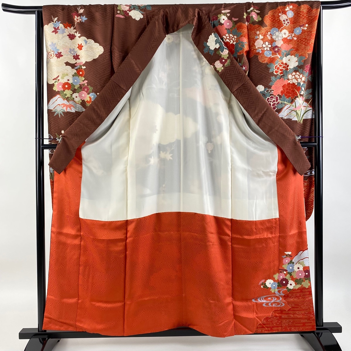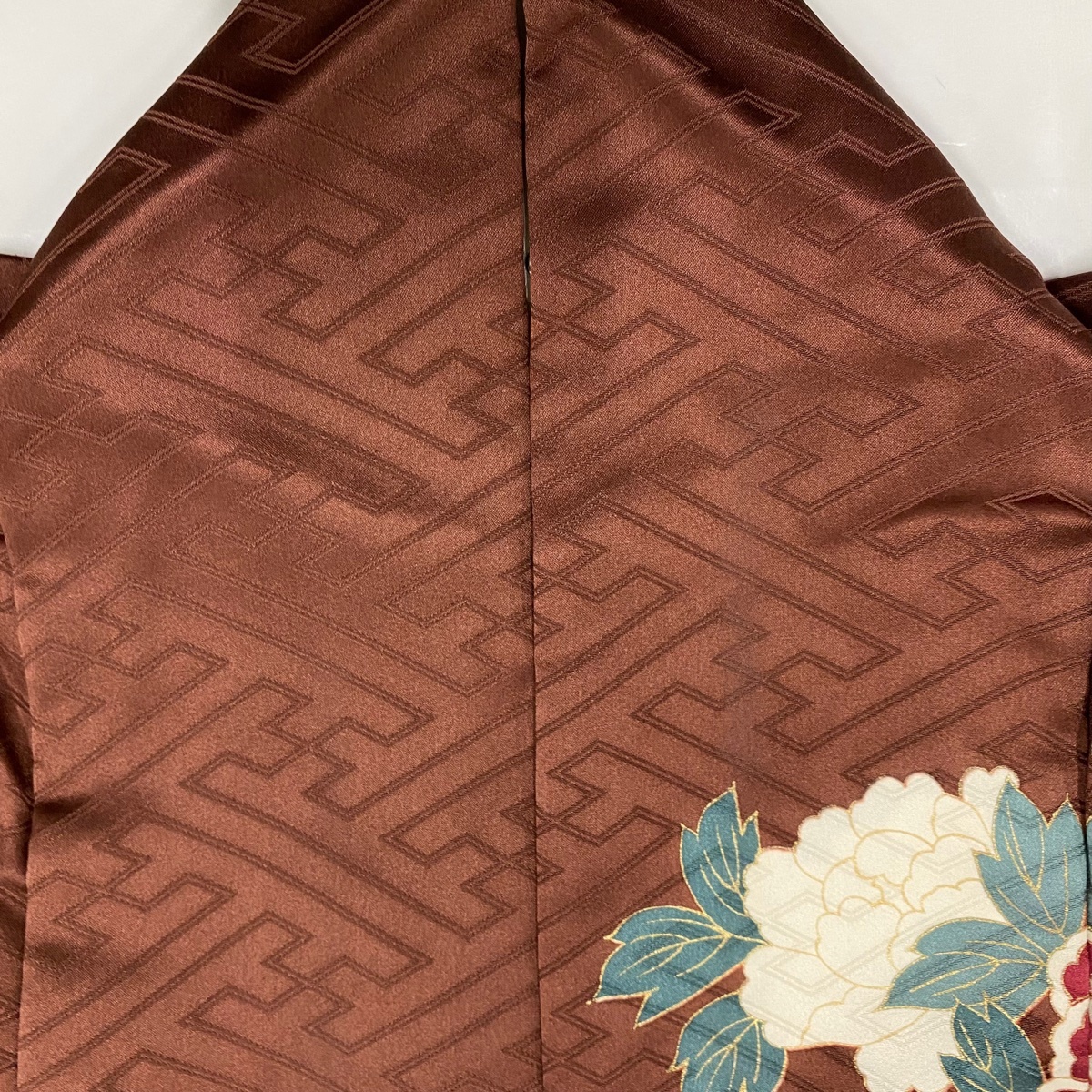 | 振袖 秀品 落款 草木友禅 牡丹 花鳥 金糸 金彩 茶紫 袷 身丈159.5 裄丈65.5 M 正絹 【中古】 |