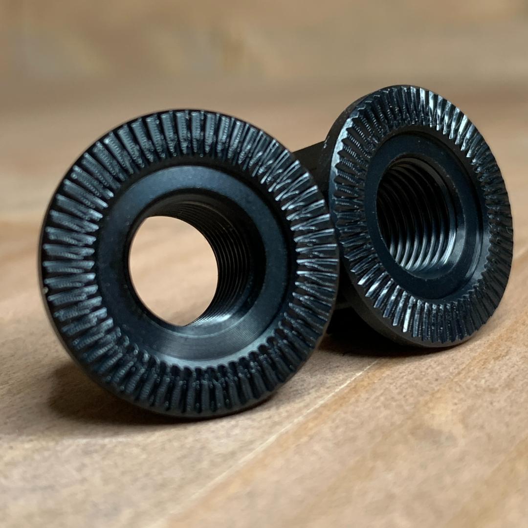 自転車のフロントホイールを固定する、アルミ合金製ハブナットです。軽量かつカラフルなデザインで、ピストバイクやナット留めのクロスバイクの足元をスタイリッシュにカスタムします。