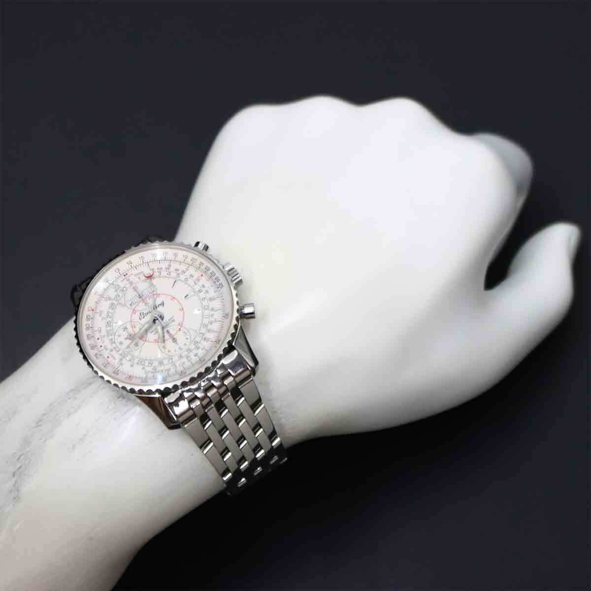 商品概要 | ブライトリングからナビタイマー・ライン の人気モデル『モンブリラン・ダトラ』です。美しさと高い機能をあわせ持ったクロノグラフで、トリプルカレンダー、回転計算尺など【腕に装備する計器】というブライトリング社の理念を見事に具現化!ケース、ブレス、ダイアルなど、どの角度から眺めても美しく、そして力強さを感じさせてくれるモデルです♪ |