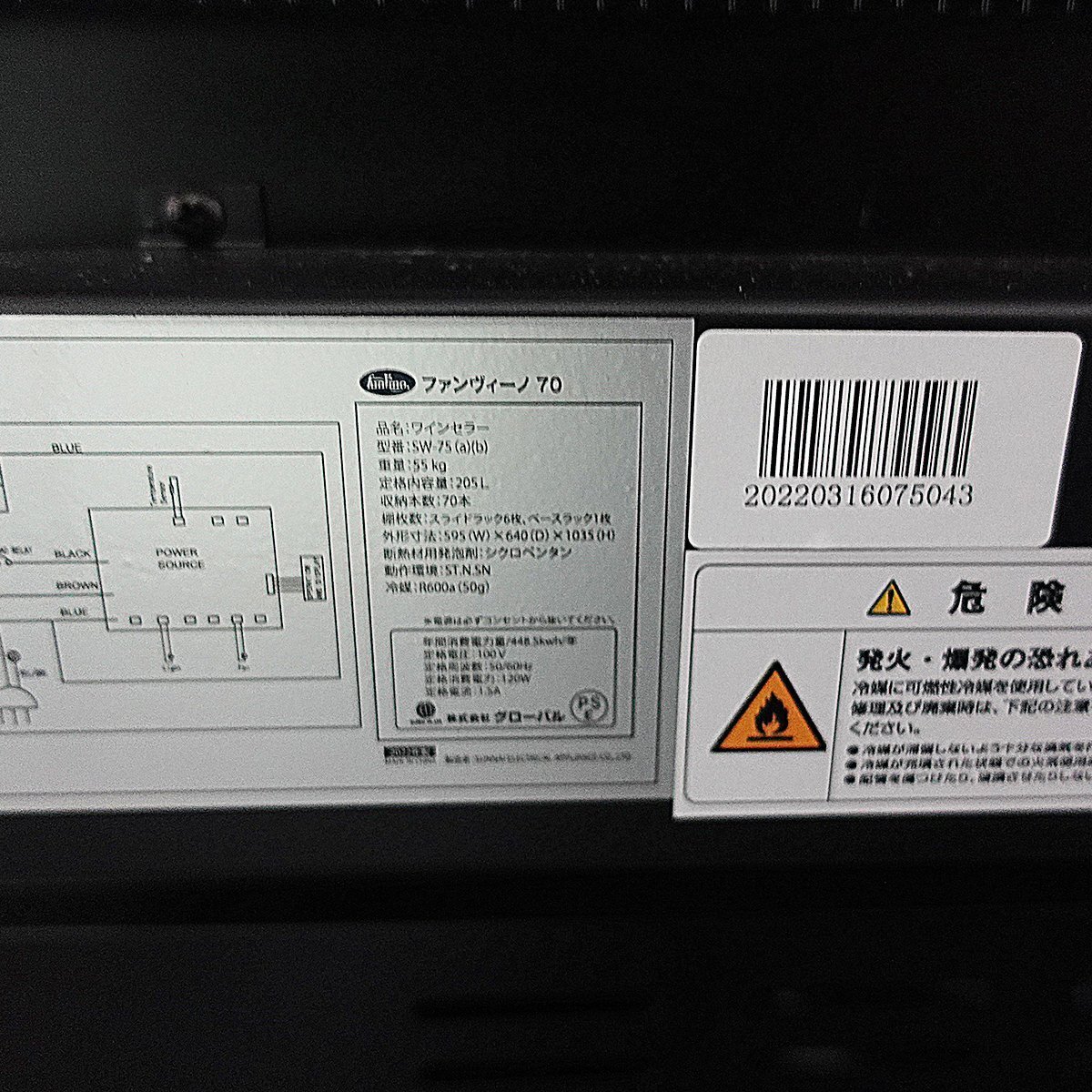 【 型 式 】 ファンヴィーノ70(SW-75) 【サ イ ズ】 幅595×奥行640×高さ1035(mm) 【 重 量 】 約55kg 【 電 源 】 単相100V 50/60Hz ・有効内容積 205L ・庫内温度 7~18℃ ・収納本数70本 |