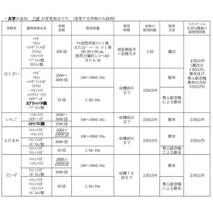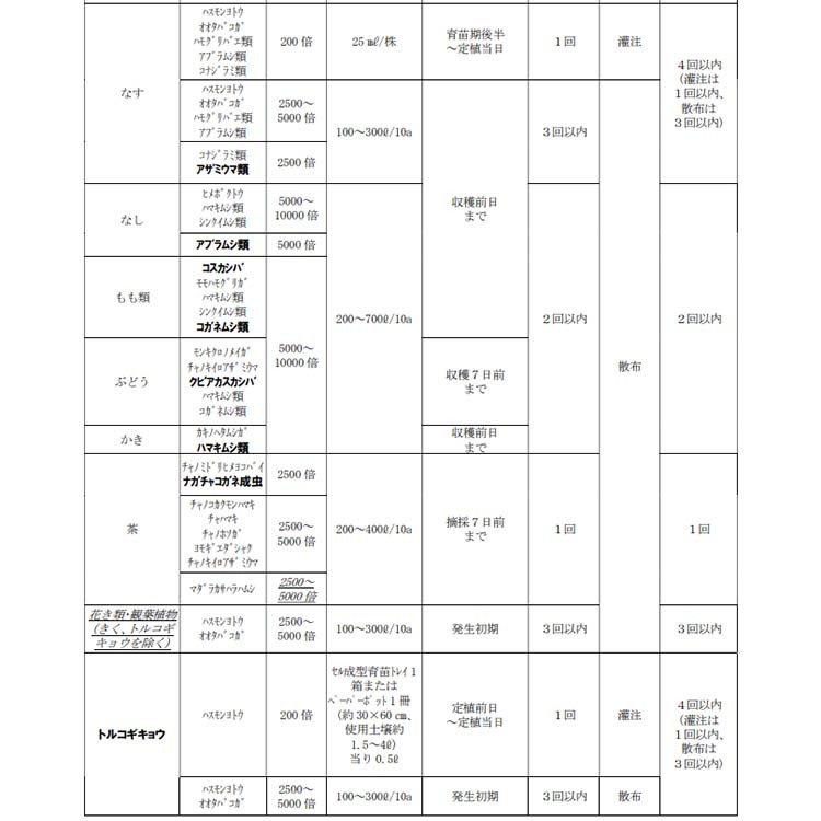 ・多くの作物で収穫前日まで散布でき、野菜は育苗期の灌注でも使用できます。