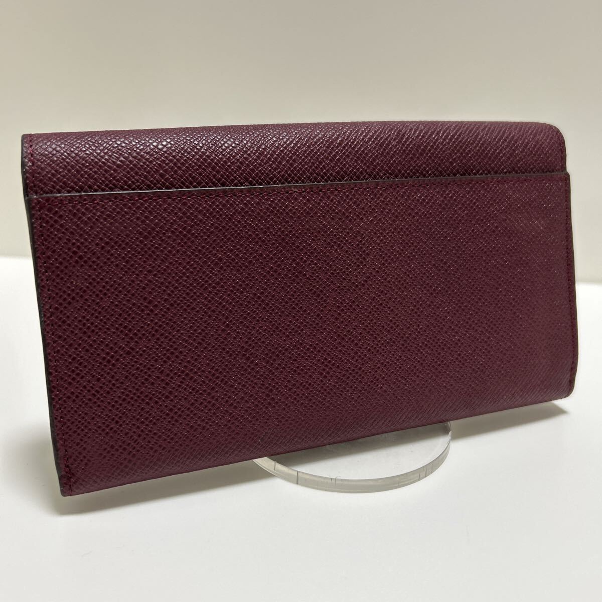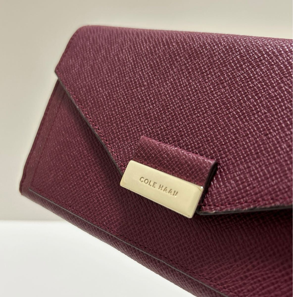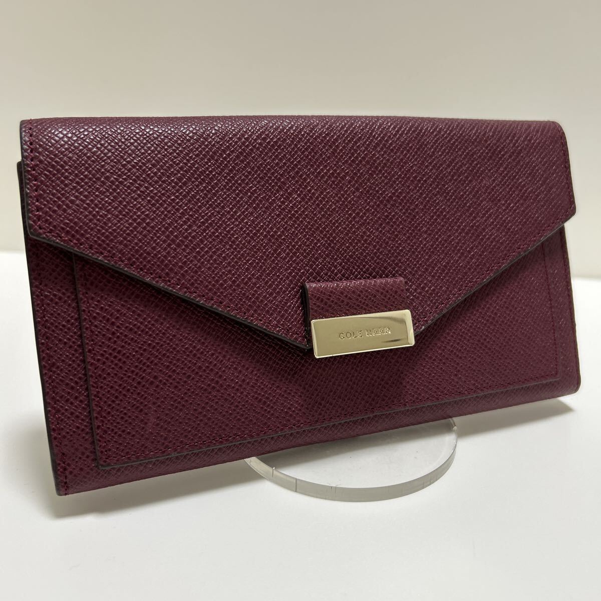 ☆美品☆ ◆COLE HAAN コールハーン  かぶせ 長財布 ボルドー系◆ 本革 小銭入れ有 ゴールドロゴ金具 正規品保証 【送料無料】0826