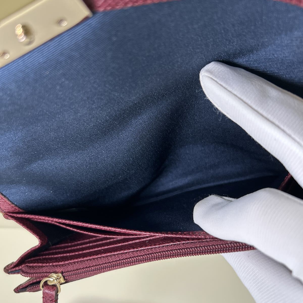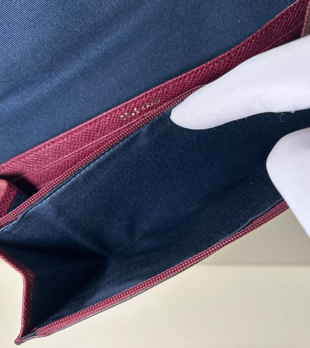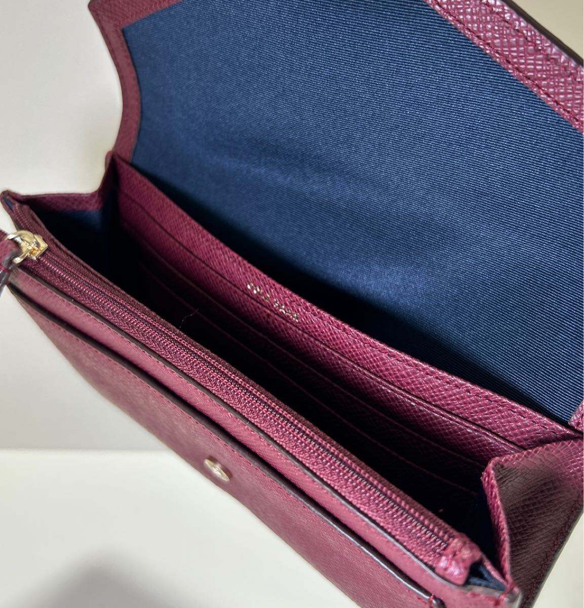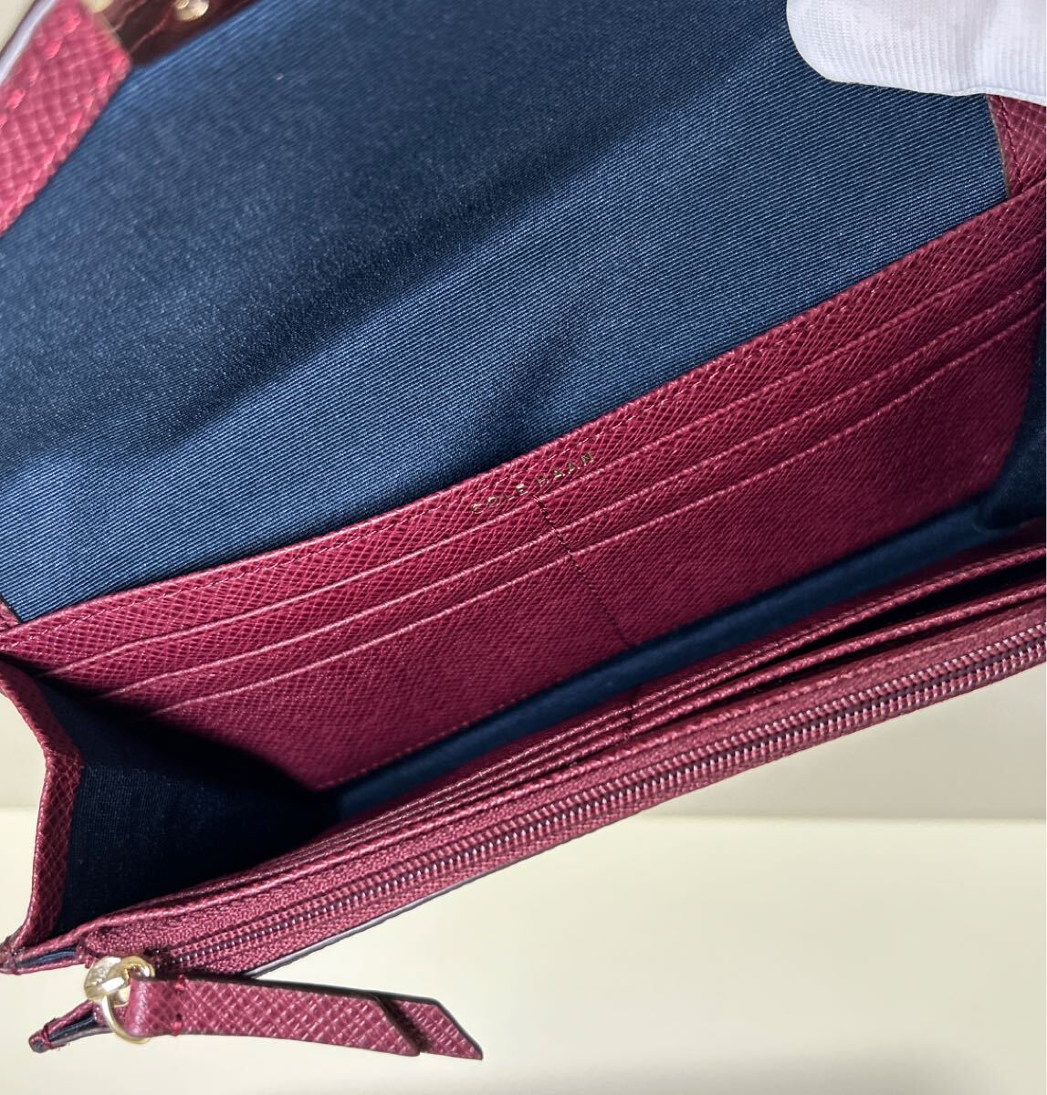 ☆美品☆ ◆COLE HAAN コールハーン  かぶせ 長財布 ボルドー系◆ 本革 小銭入れ有 ゴールドロゴ金具 正規品保証 【送料無料】0826