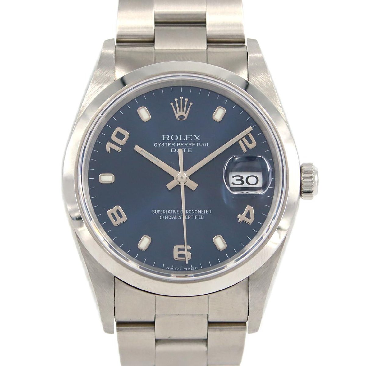 1990年頃から2000年代中頃まで製造された「オイスターパーペチュアルデイト」Ref.15200。落ち着いたブルーダイヤルに、2-4-6-8-10の数字を配したユニークな「飛びアラビア」インデックスが目を惹く一本です。34mmという絶妙なケースサイズは腕馴染みが良く、上品な印象を与えます。ムーブメントには、長年にわたりロレックスの主力機として活躍した傑作キャリバー3135を搭載し、高い信頼性と実用性を誇ります。
