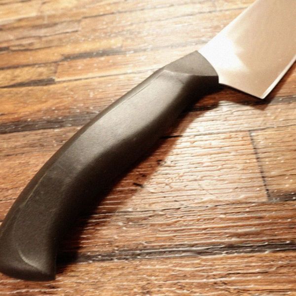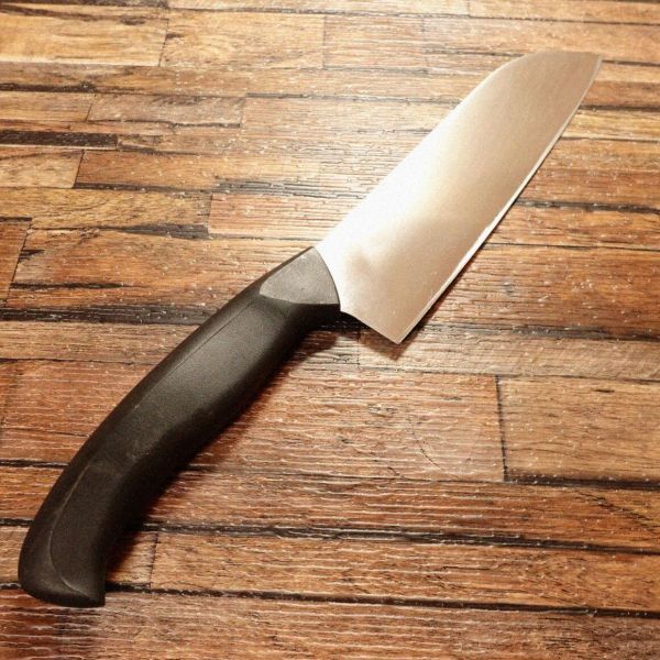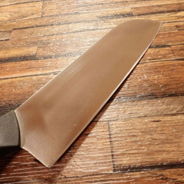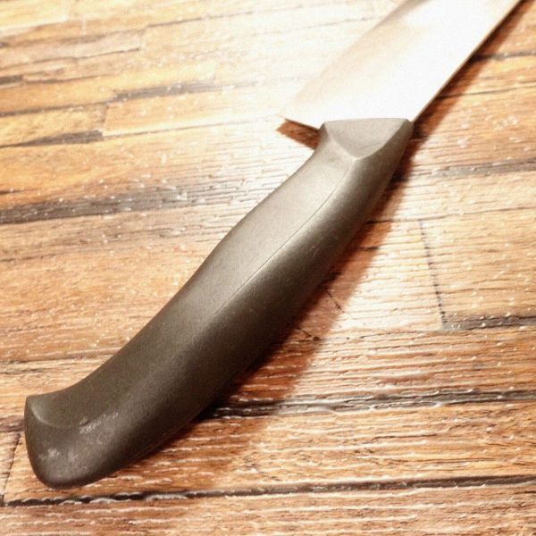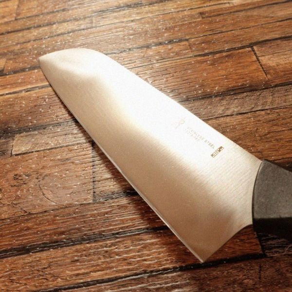 三徳包丁は和洋の要素を取り入れた万能包丁で、肉・魚・野菜に幅広く対応できます。このお品は両刃のステンレス製で、扱いやすくお手入れも簡単です。あまり使用感も感じない状態の良いお品です。