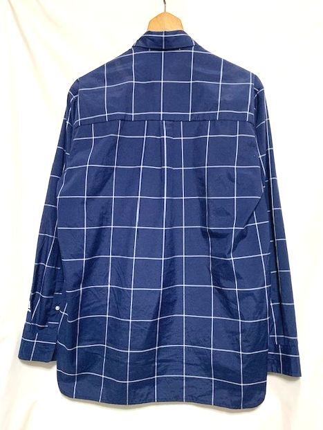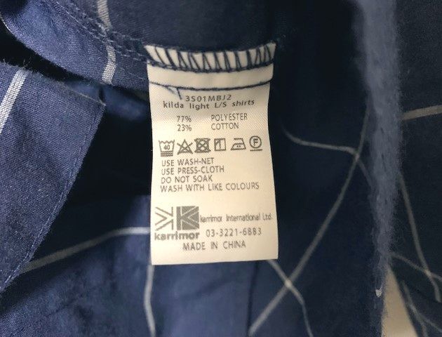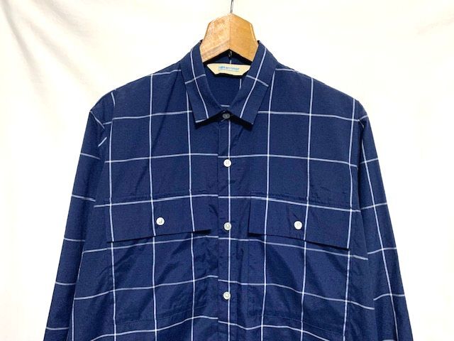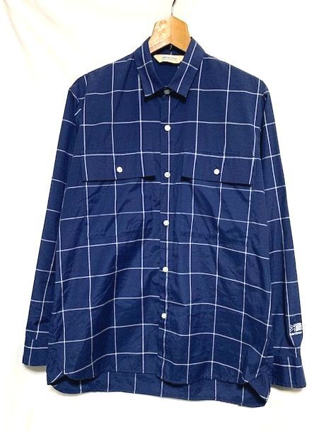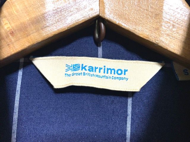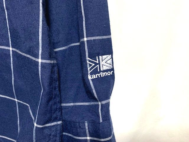 薄くハリがあり、表面にうっすらとした光沢のあるコットンポリエステル混のシャツ生地を使用したチェックシャツです。サラッとした肌触りで吸汗速乾性も高く、アウトドアはもちろん、デイリーユースとしても快適に幅広く使っていただけます。左袖すそには karrimor のロゴ刺繍がワンポイントで入ったデザインです。両胸には大きめなフラップポケット、襟はやや小さめ、身幅と肩幅は広めなボックスシルエットです。カラーもネイビーにホワイトのラインのシンプルなウィンドウペーンチェック柄です。比較的綺麗な状態で出品させていただきますので、是非、ご活用いただけたらと思います。