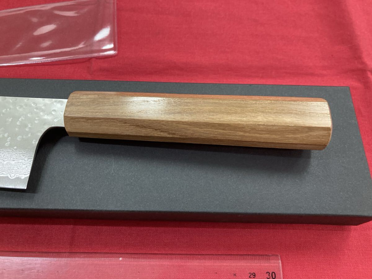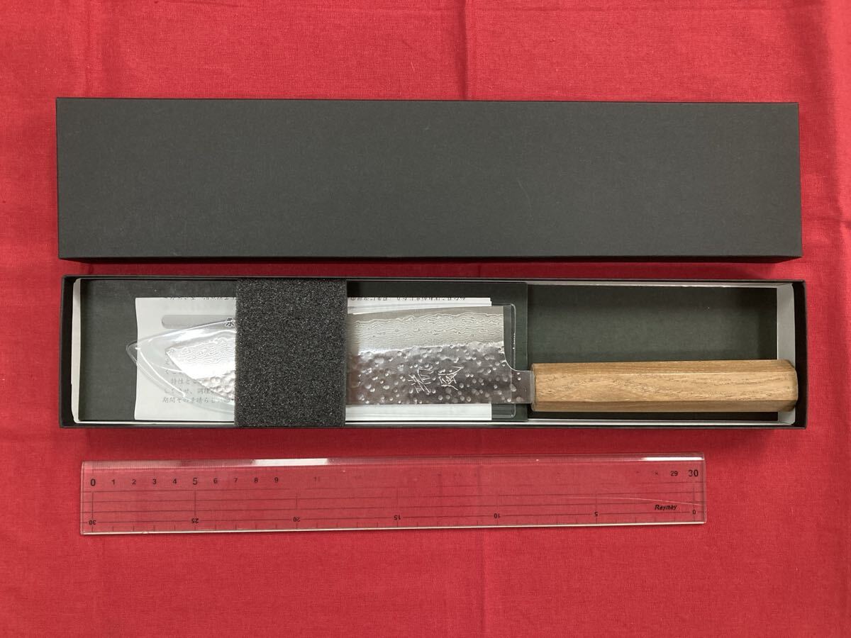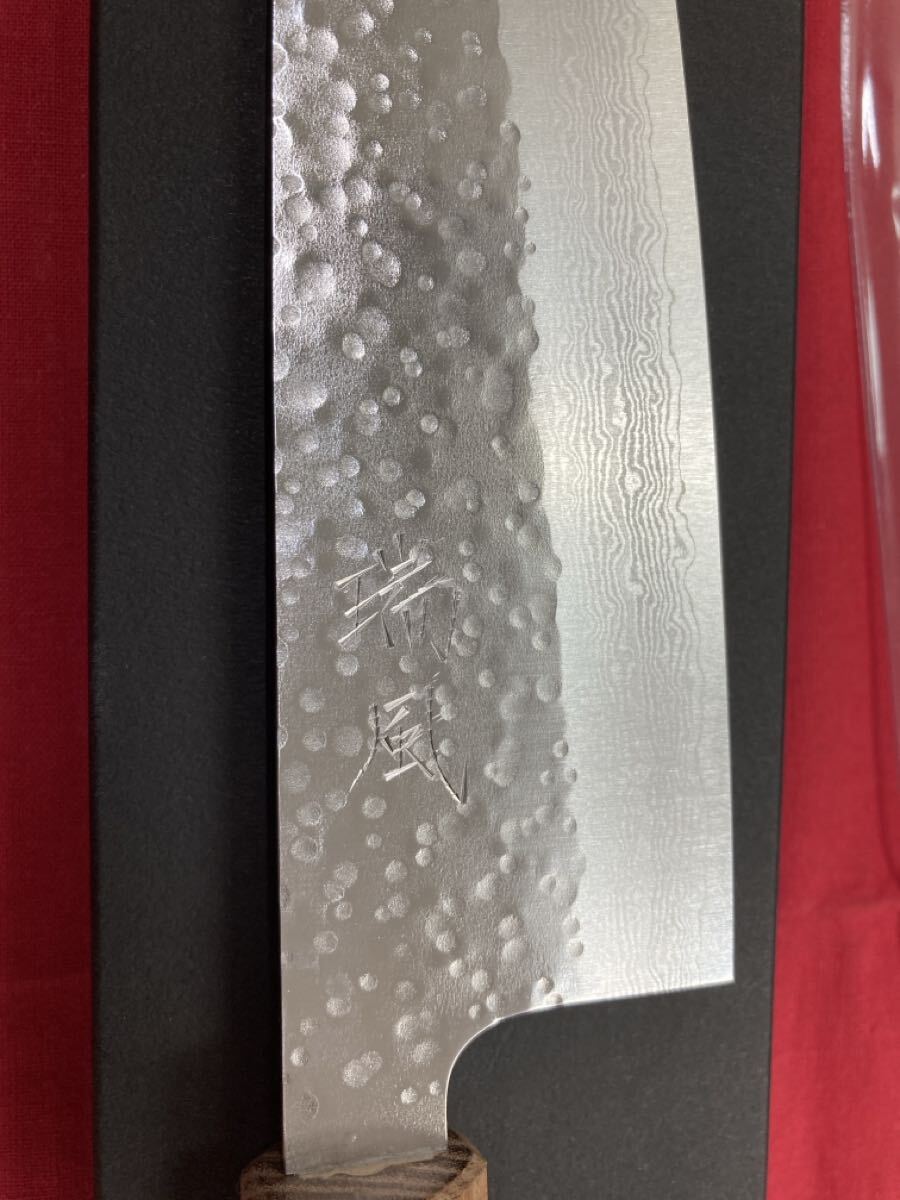 槌目打ちの模様と積層ダマスカスの波紋が、持ち手の延寿のハンドルと合わさり高級感を持ちながらもシットリと落ち着いた印象をもたらします。軽く女性の方でも使い回しがとても便利と評判です。