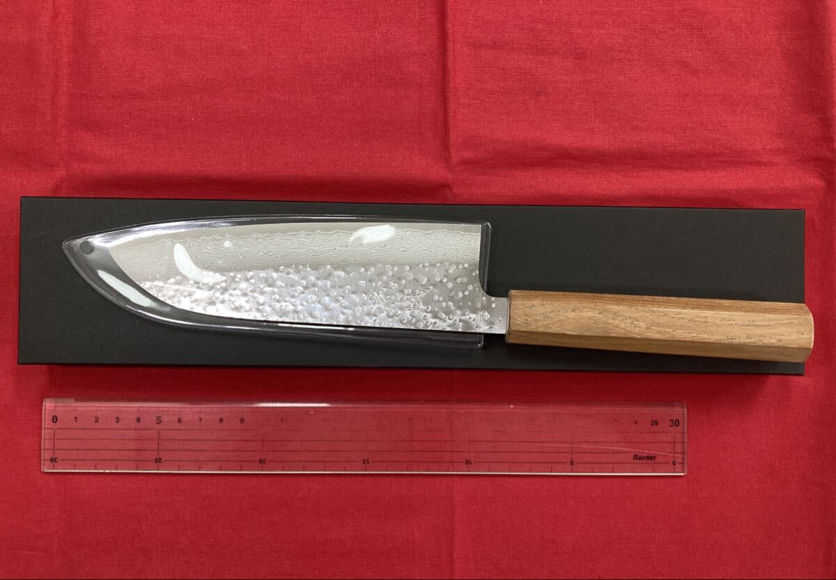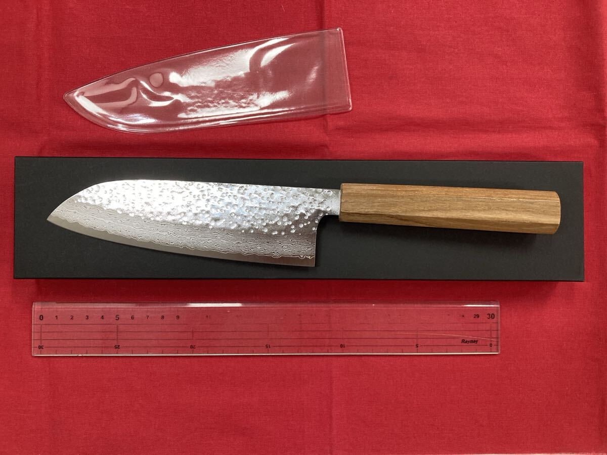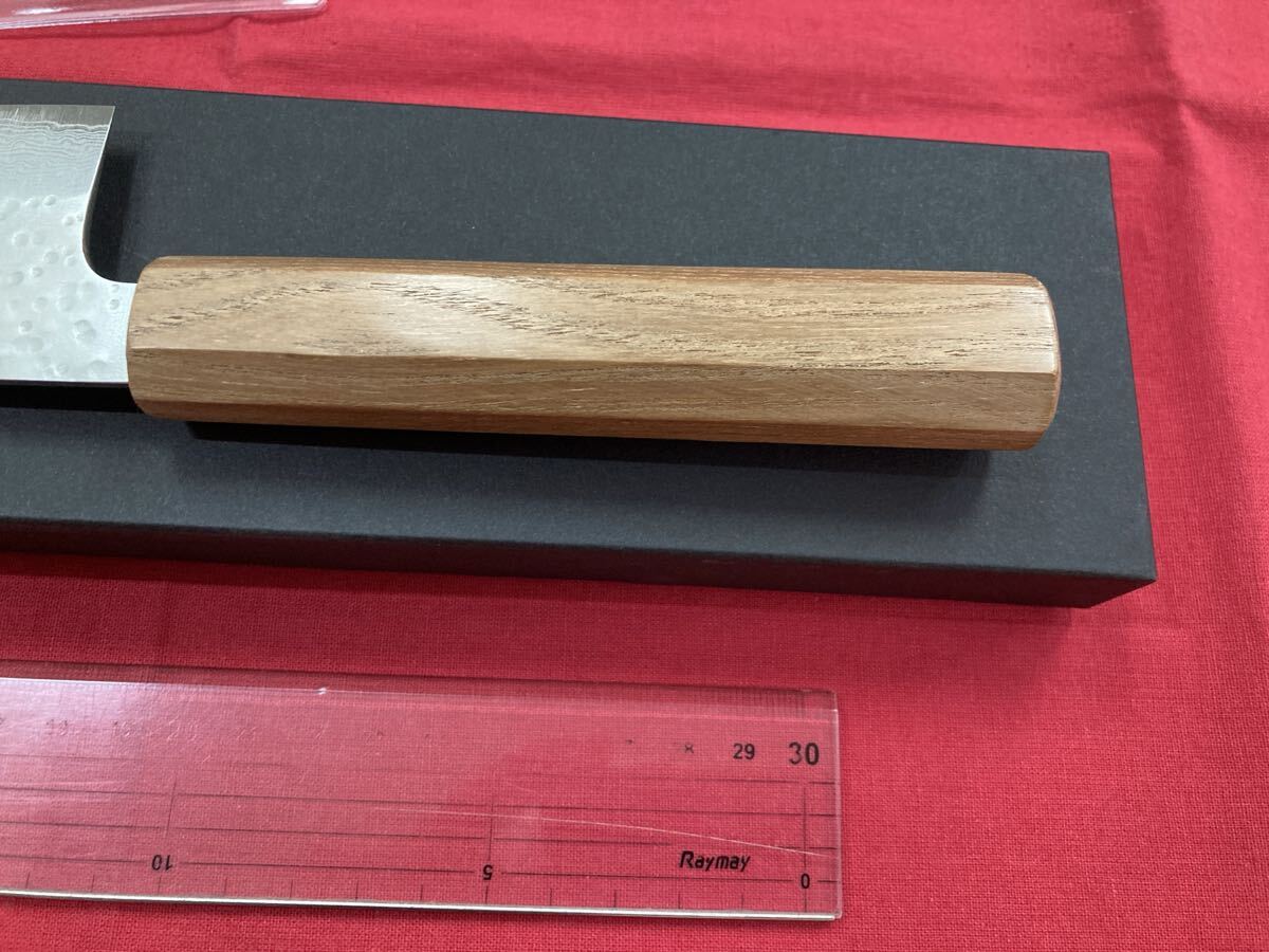 槌目打ちの模様と積層ダマスカスの波紋が、持ち手の延寿のハンドルと合わさり高級感を持ちながらもシットリと落ち着いた印象をもたらします。軽く女性の方でも使い回しがとても便利と評判です。