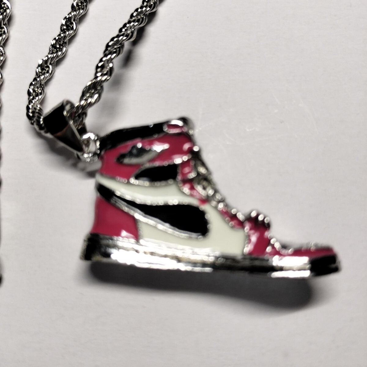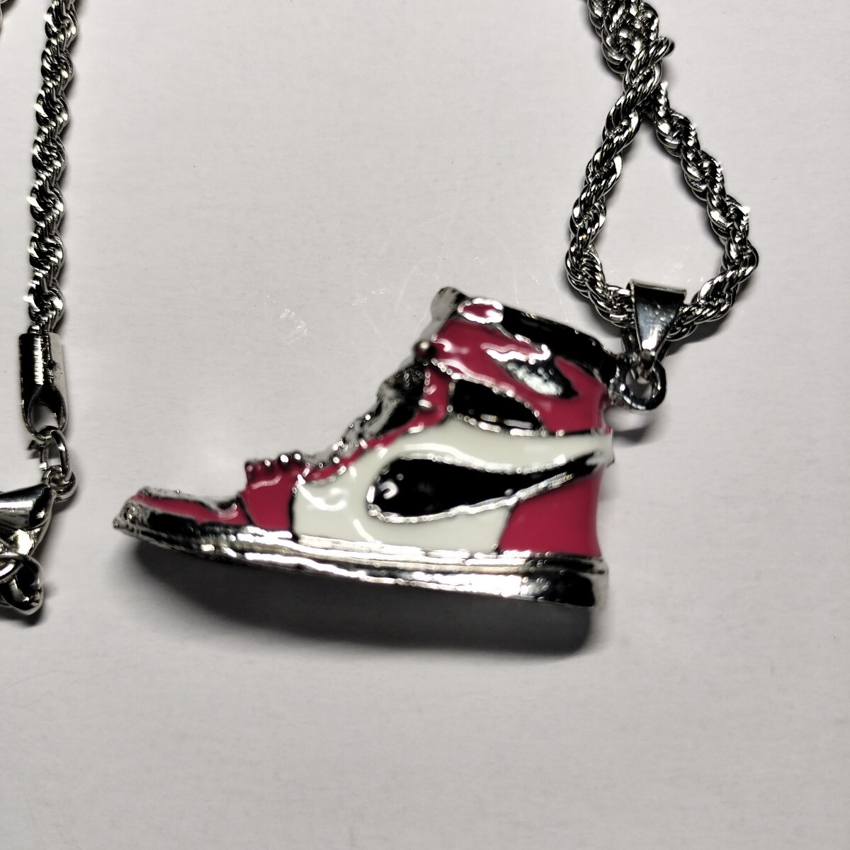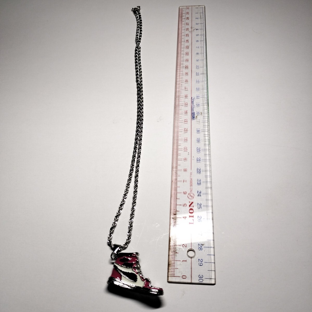 AJ1もどきのペンダントネックレスです。首に掛けるだけでなく、靴にアクセントでシューレースに引っ掛けて飾るのもありです。白赤のAJならバッチリです。カバンにアクセサリーとしても行けます。