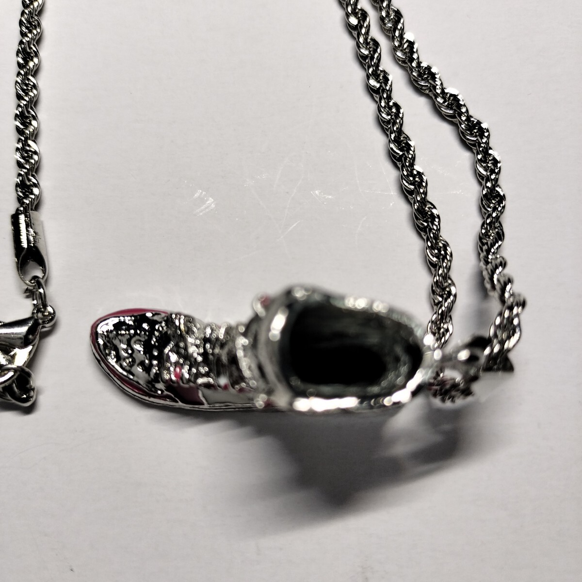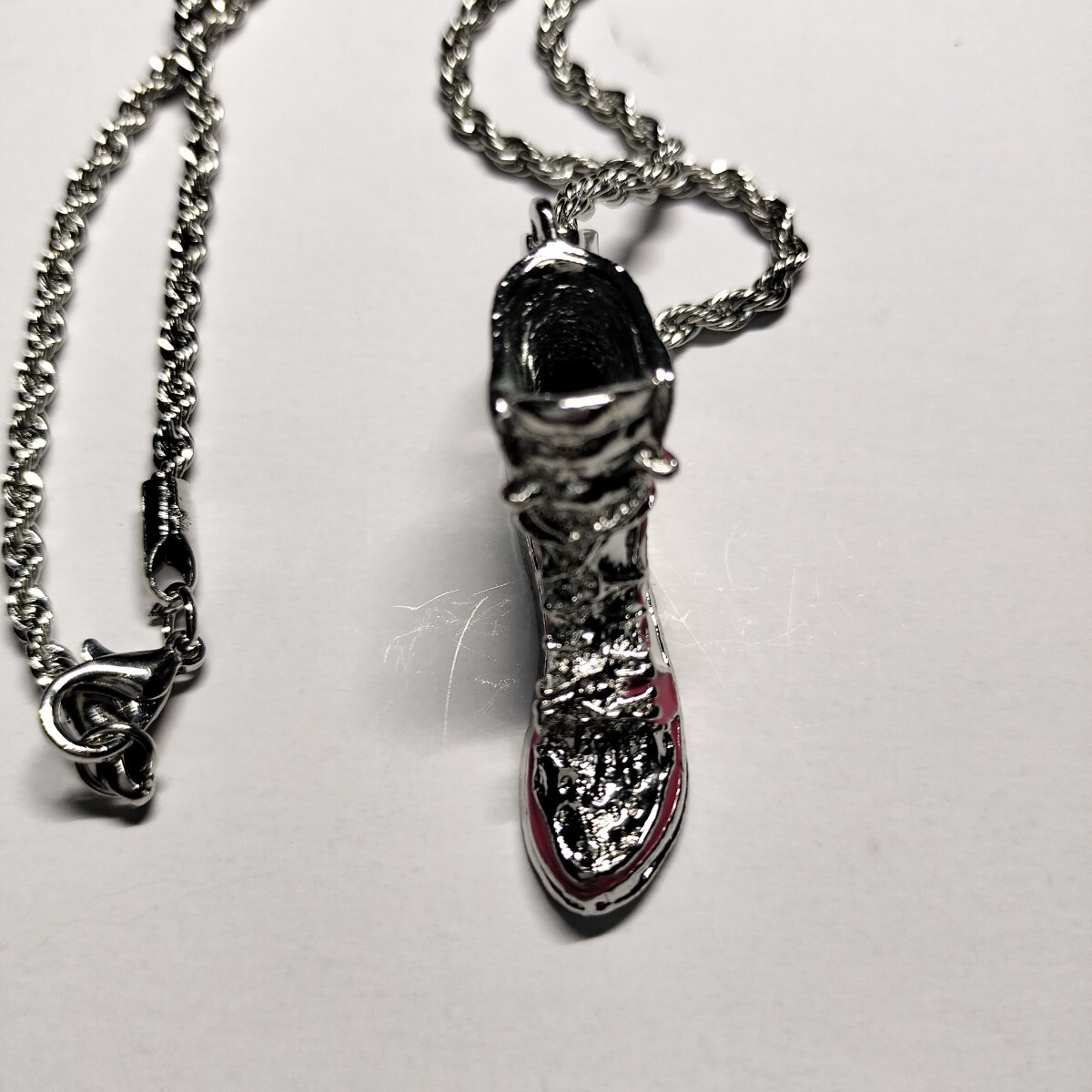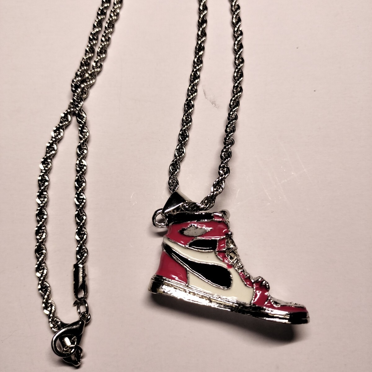 AJ1もどきのペンダントネックレスです。首に掛けるだけでなく、靴にアクセントでシューレースに引っ掛けて飾るのもありです。白赤のAJならバッチリです。カバンにアクセサリーとしても行けます。