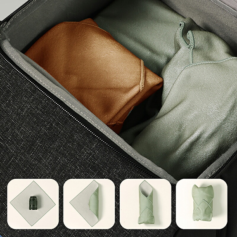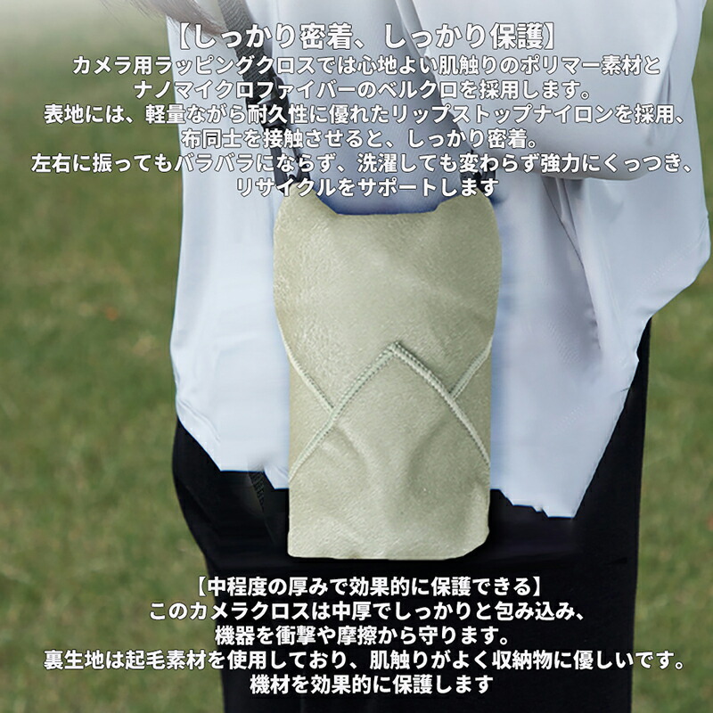 カメラ用ラッピングクロスでは心地よい肌触りのポリマー素材とナノマイクロファイバーのベルクロを採用します。 表地には、軽量ながら耐久性に優れたリップストップナイロンを採用、布同士を接触させるとしっかり密着。左右に振ってもバラバラにならず、洗濯しても変わらず強力にくっつき、リサイクルをサポートします