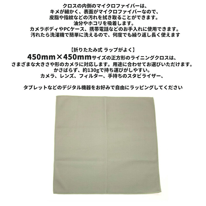 油分やホコリを吸着します。カメラボディやPCケースなどのお手入れに使用できます。汚れたら洗濯機で簡単に洗えるので、何度でも繰り返し長く使えます
