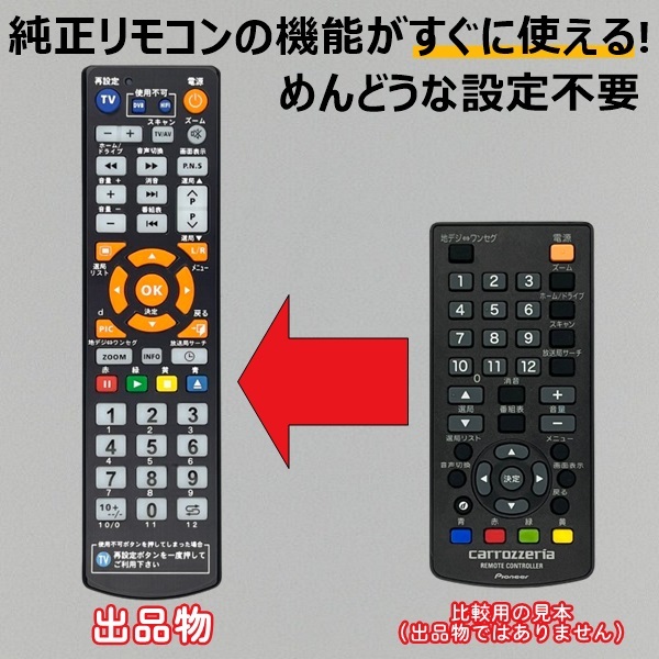 | 【商品名】 Pioneer HRMP20H 代替リモコン 【対応機種】 GEX-909DTV用 比較画像の右側の純正リモコンが付属する機種に使用出来ます。 上記機種以外については、質問欄よりメーカーと型番をご連絡頂ければ、対応品のご案内をしております。 【商品について】 左側の代替リモコンが出品物になります。右側のリモコンは見本画像です。 タイトル機種のリモコン信号を入力した、設定不要で使える純正品と同等の代替リモコンです。 乾電池は付属しません。別途ご用意下さい。(単4乾電池×2本) 【商品サイズ】 縦18.5cm×横5cm×高さ2.35cm 【発送について】送料無料 迅速発送を心掛けております。土日祝日はお時間を頂く場合ございます。 ポスト投函配達となり、日時指定は出来ません。 | ||