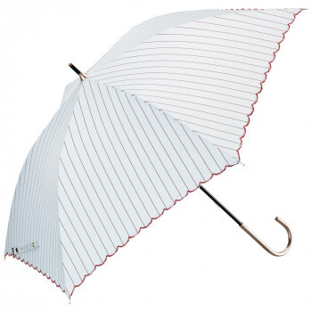 | 人ごみの中でも使いやすい大きさと軽さの傘。UVカット率99.9%、高い遮光・遮熱性。マルシェの屋根をイメージしたパターン。細いストライプと裾の刺繍が繊細でこだわりのあるデザインです。 |
