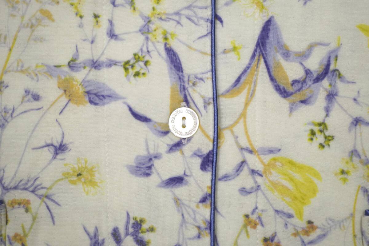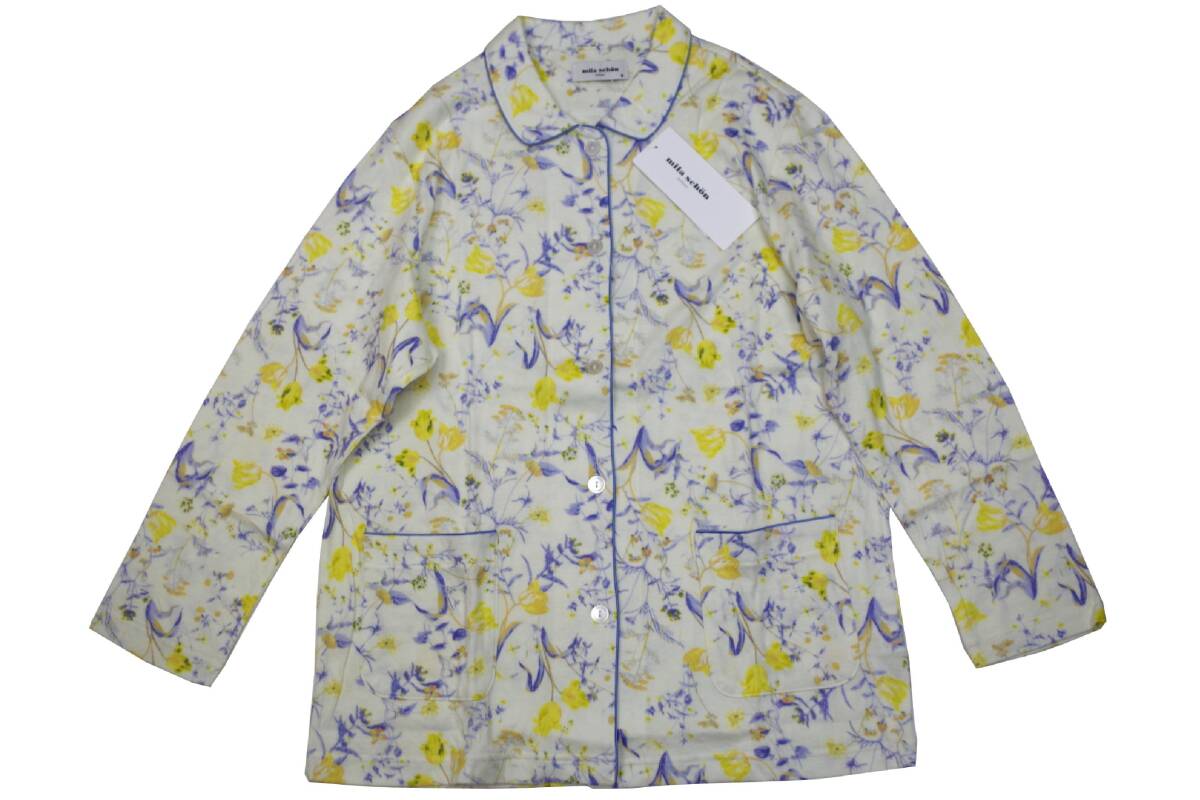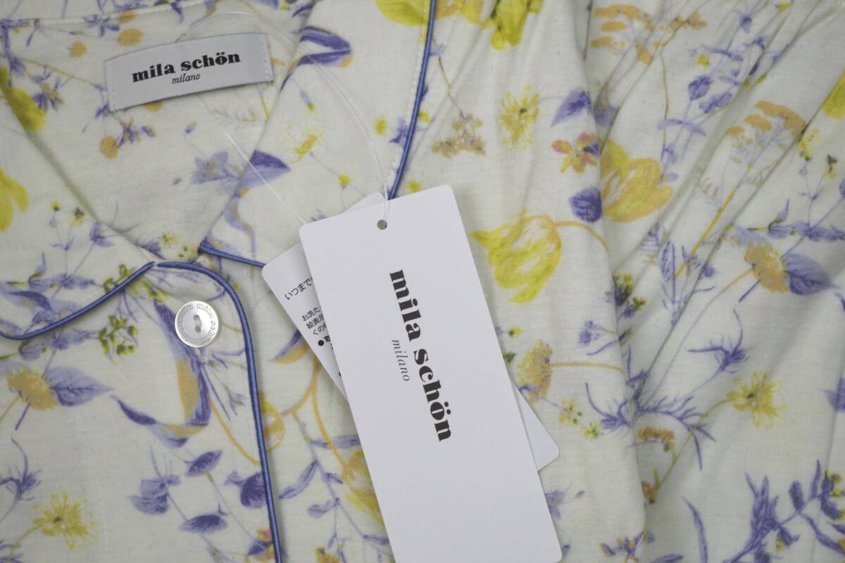 ■ミラショーン mila schonのスリーシーズン 接結ニットパジャマ、新品です。秋口から春先まで長いシーズン着用できます。前開き、長袖、ロングパンツ。サイズはL、バスト86-94cm。 素材は綿100%。2枚の薄い生地を重ねて1枚にした生地です。 生地隙間に空気の層が出来るので、膨らみがあって柔らかく温かいのが特徴です。伸縮性があります。色はオフホワイト地。正規ライセンス会社扱い品の日本製。定価19800円のお品です。