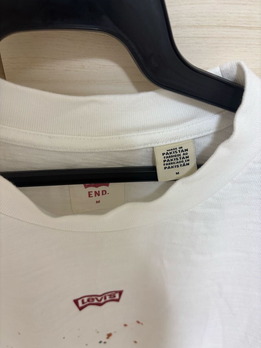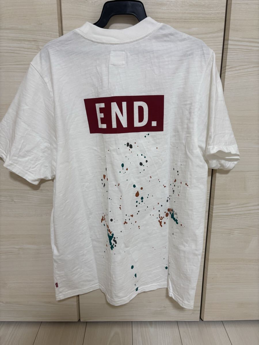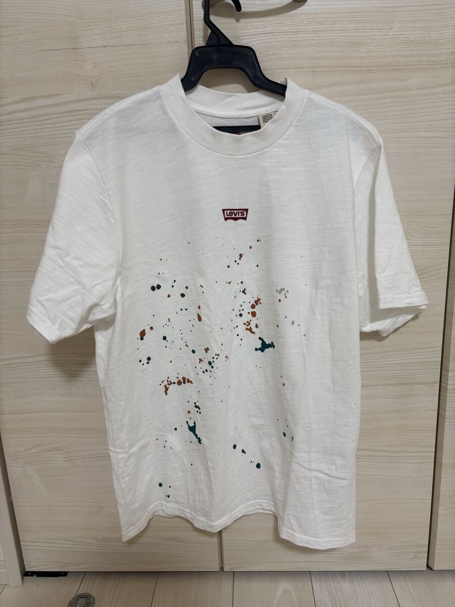 ホワイトのスプラッシュプリントTシャツ、Mサイズ、クルーネック。