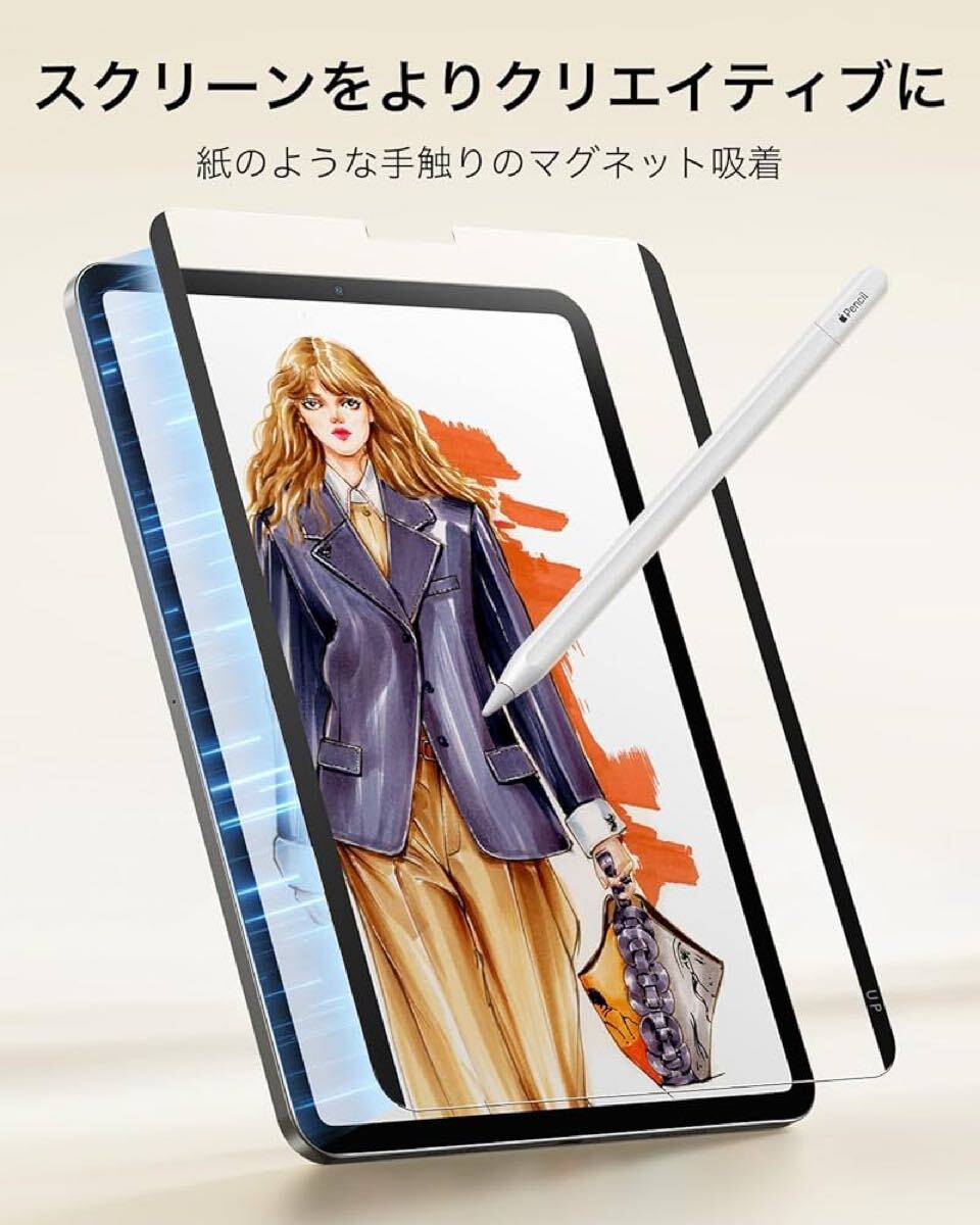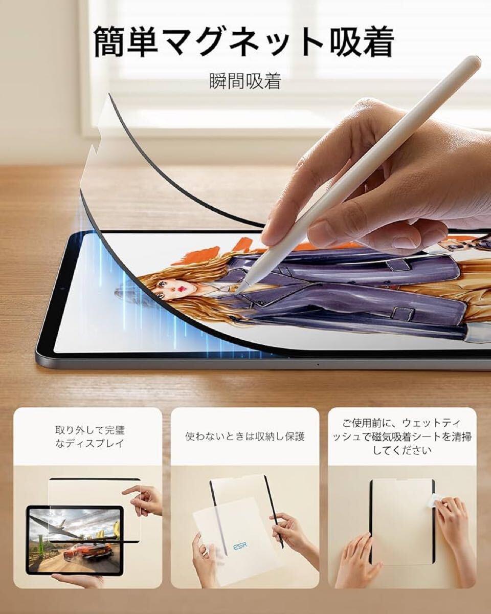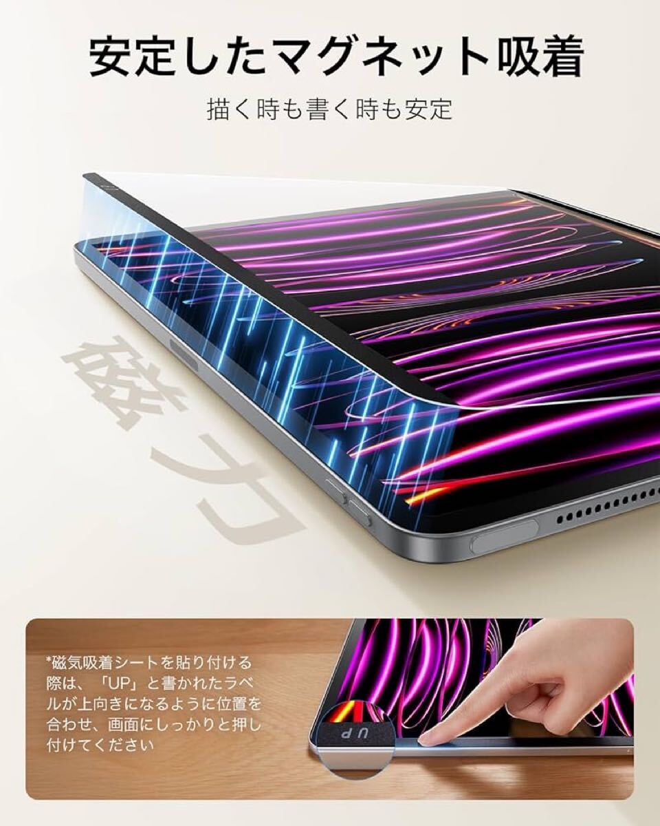 便利なマグネット式アタッチメント: 使用時にはワンタッチで iPad 画面に取り付けられ、使用後は簡単に取り外してビデオを見ることができます。