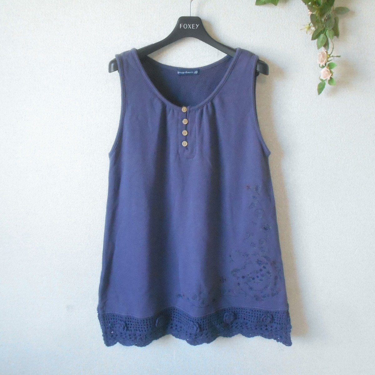 【ポイント】ドラッグストアーズのチュニックになります。お色は濃いパープル系ベースでスウェット生地の秋冬を中心に着ていただけるお品です。裾にはお花のモチーフが付いた、とっても素敵なデザインです。