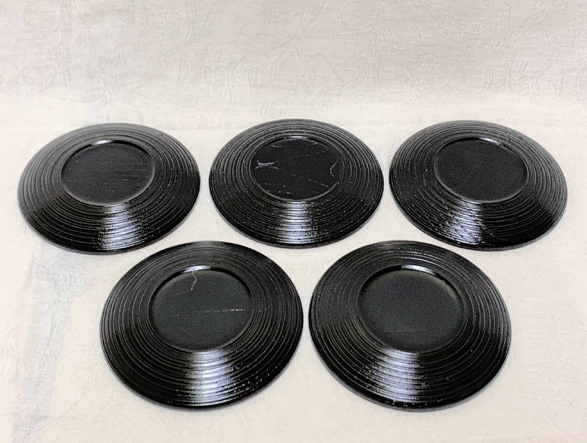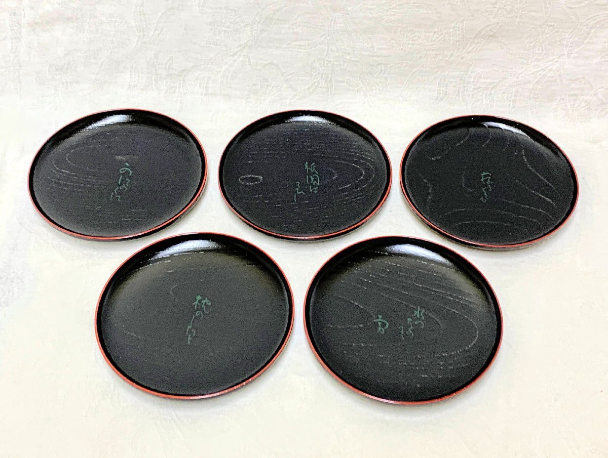 17747/吉井勇『酒ほがひ』 かにかくに 祇園はこひし寝るときも 枕のしたを水のながるる 黒塗 銘々皿 菓子皿 5客 未使用 紙箱 木製漆器 茶
