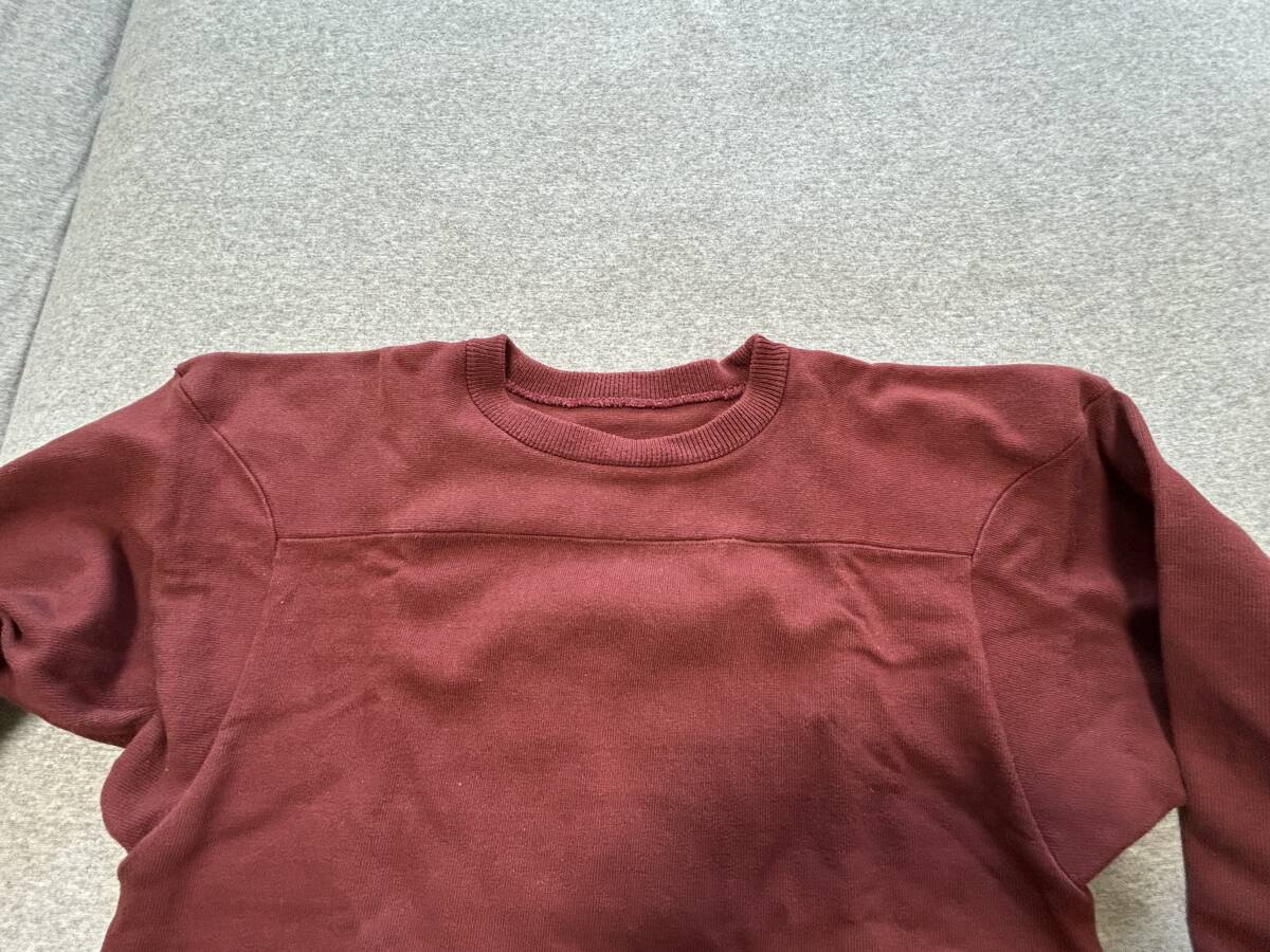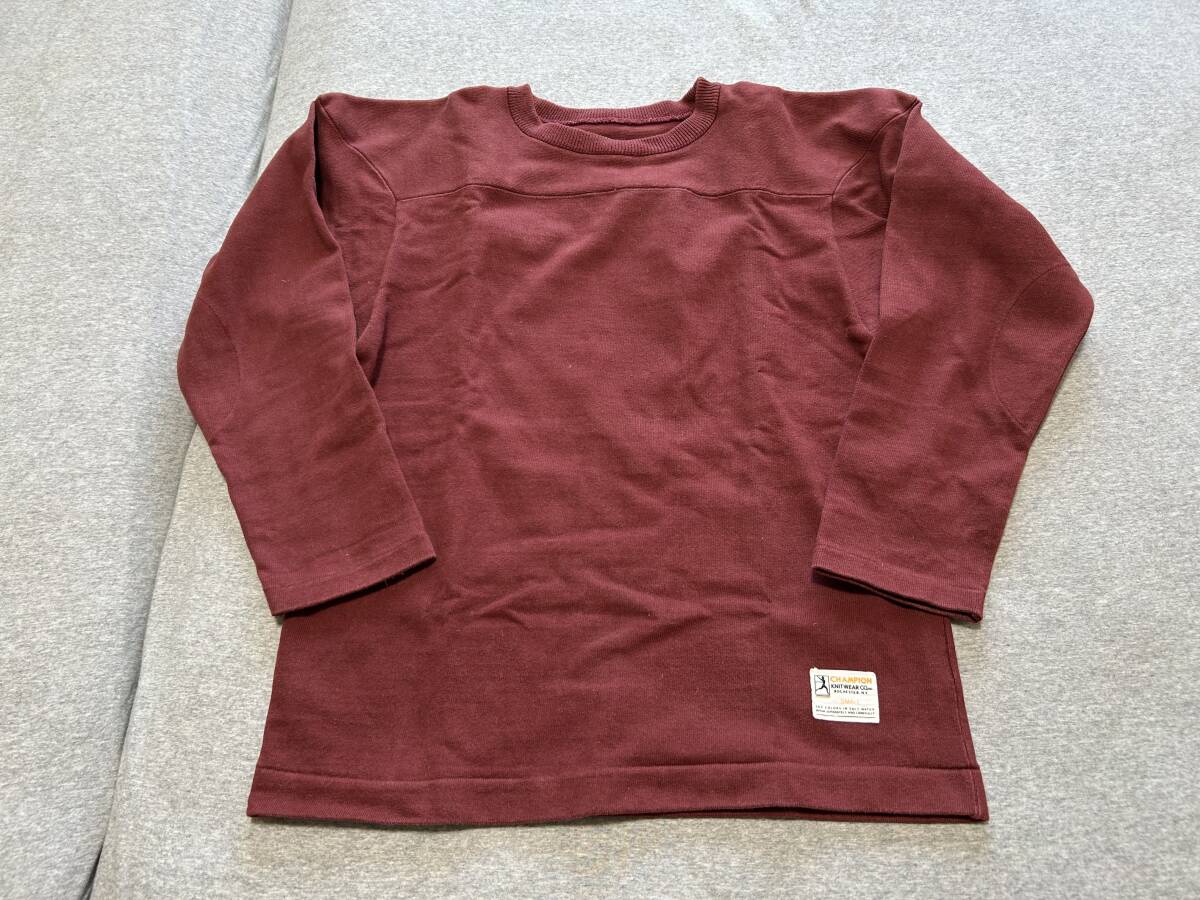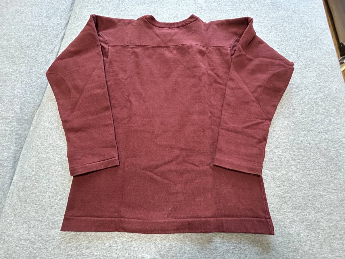チャンピオンのTrue to ArchivesシリーズのフットボールTシャツ。かなり厚手の生地、綿100%、日本製。表記サイズS。身幅49cm、袖丈49cm、後着丈63cm。定価は20,900円になります。コットン100%の生地を使用していた1960年代までのアメリカンフットボール用練習着を復刻した、プラクティスフットボールTシャツ。肉厚な生地と、補強のため肩部分と肘部分を二重にした仕様が特長です。左裾に付けた「RUNNINGMAN(ランニングマン)」のジョックタグも、1950年代のデザインを忠実に再現。左袖にCロゴワッペンが付いていない点も当時の仕様。ユーズドにつき、ノーリターン、ノークレームでお願いいたします。