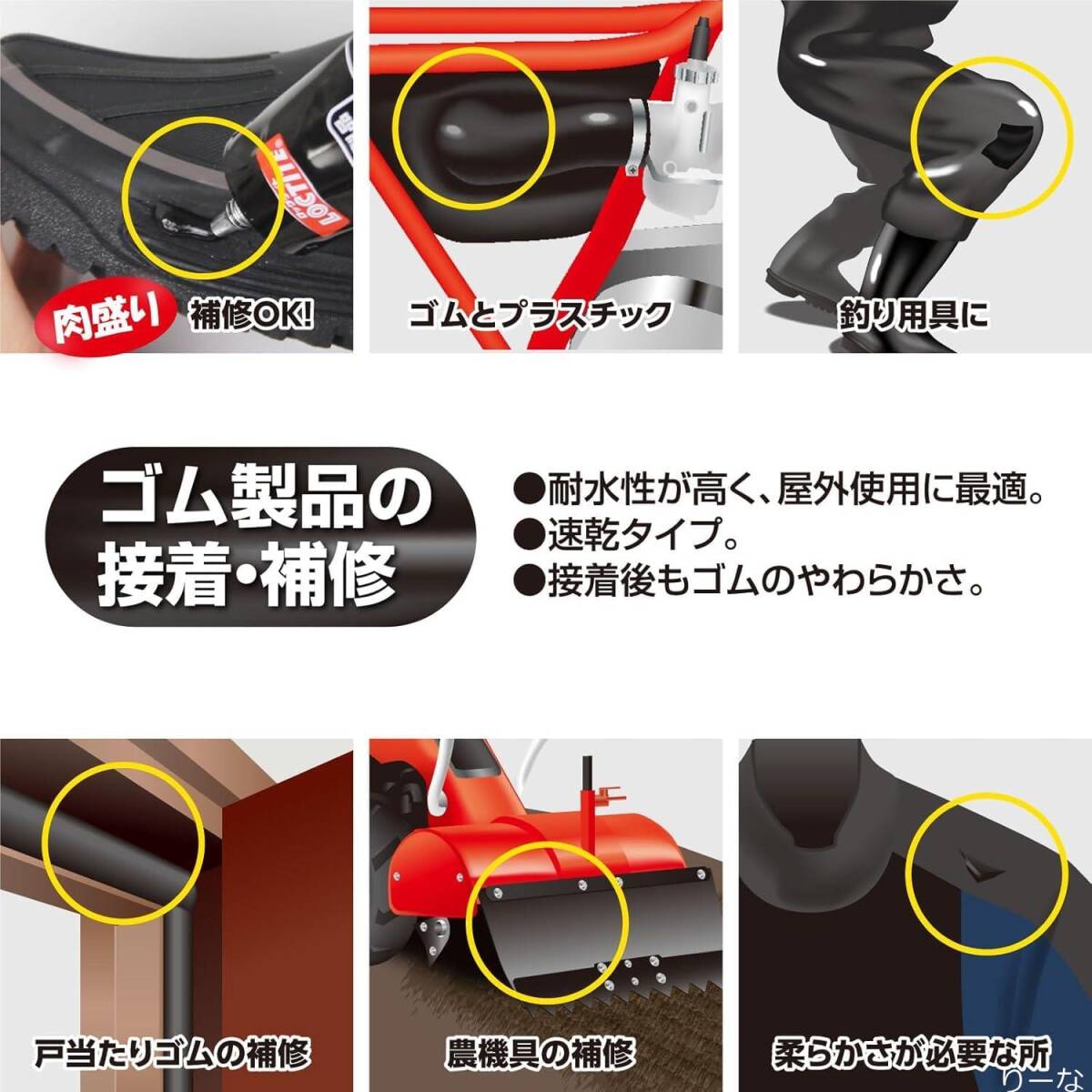 低粘度:長靴や戸当たりゴム、靴底などゴム状物質の補修に適しています。