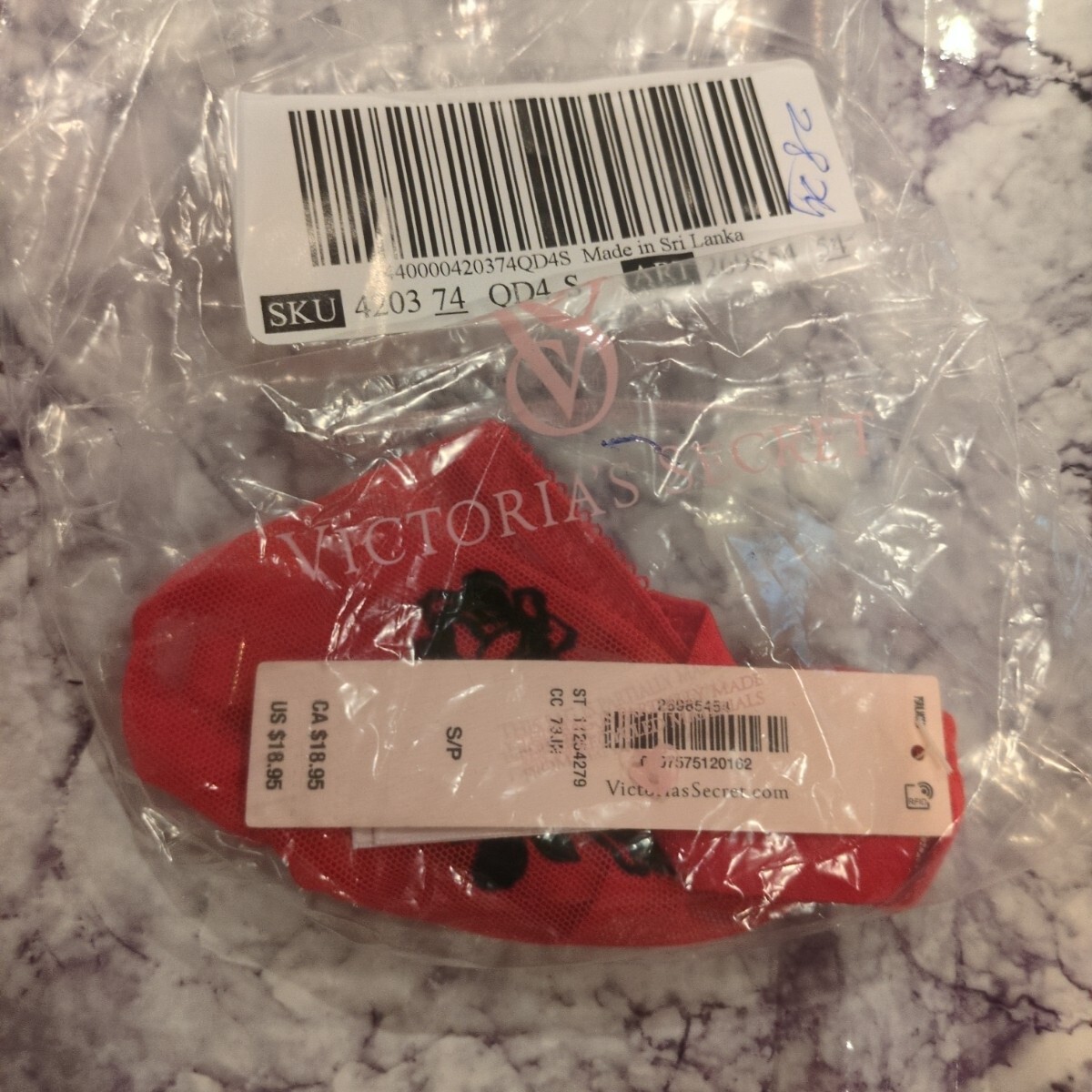 レッドのメッシュデザインに刺繍が施されたTバック、サイズS。