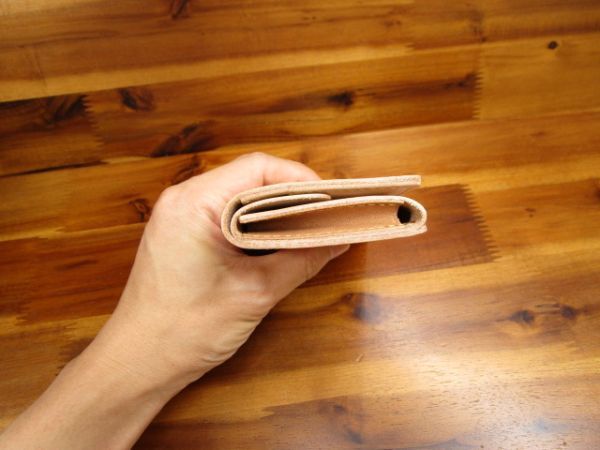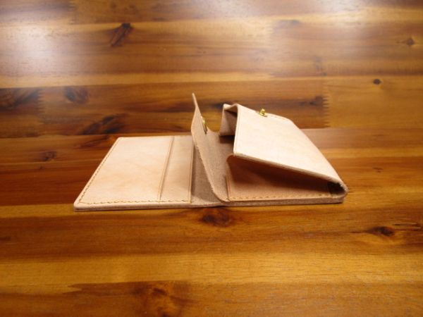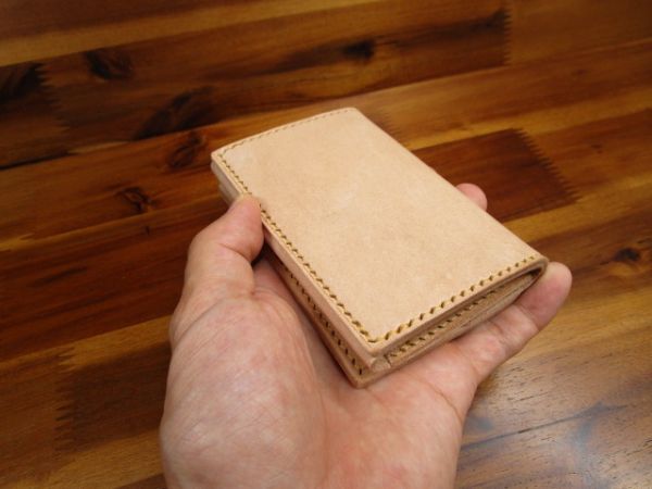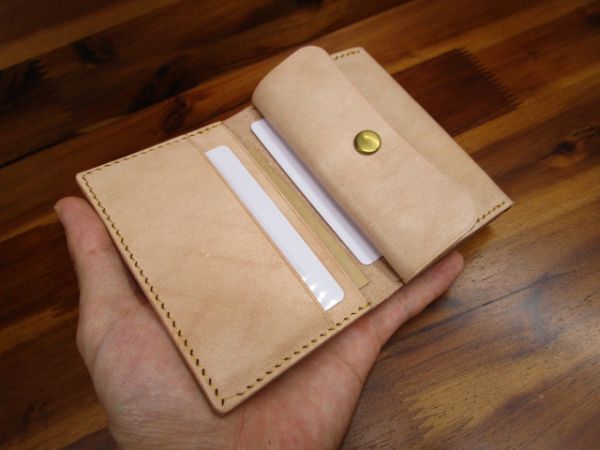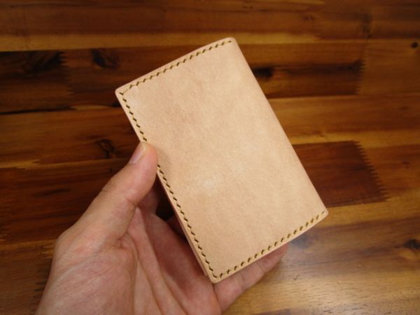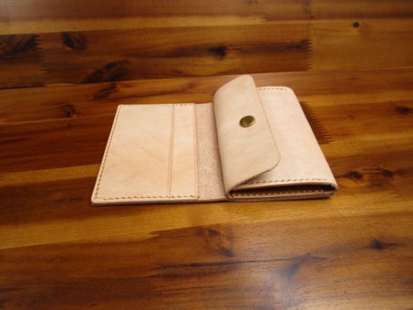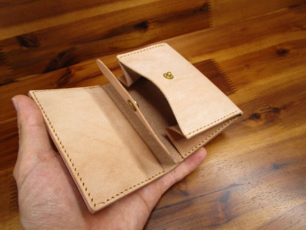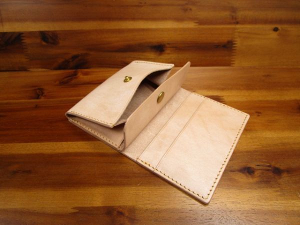 カード、コイン、折りたたんだお札をコンパクトにまとめます。  栃木レザー社製ナチュラルタンニンレザーを使用、  切り出しから、仕上げまで、すべて手作業で製作しました。  カードケースとして、コインケースとして、小物入れとして、  自由にご活用いただければと思います。  カードポケットが全部で3つ、がばっと開く見やすい小銭入れが1つ  閉じたサイズが7,5cm×11cm、とコンパクトなサイズ、  お札は三つ折りで収納できます。