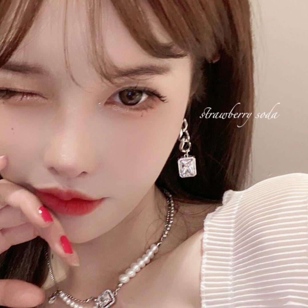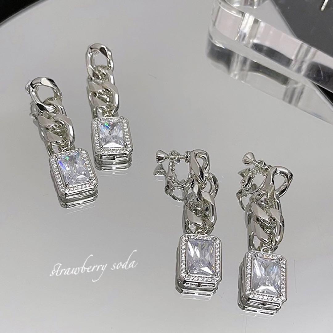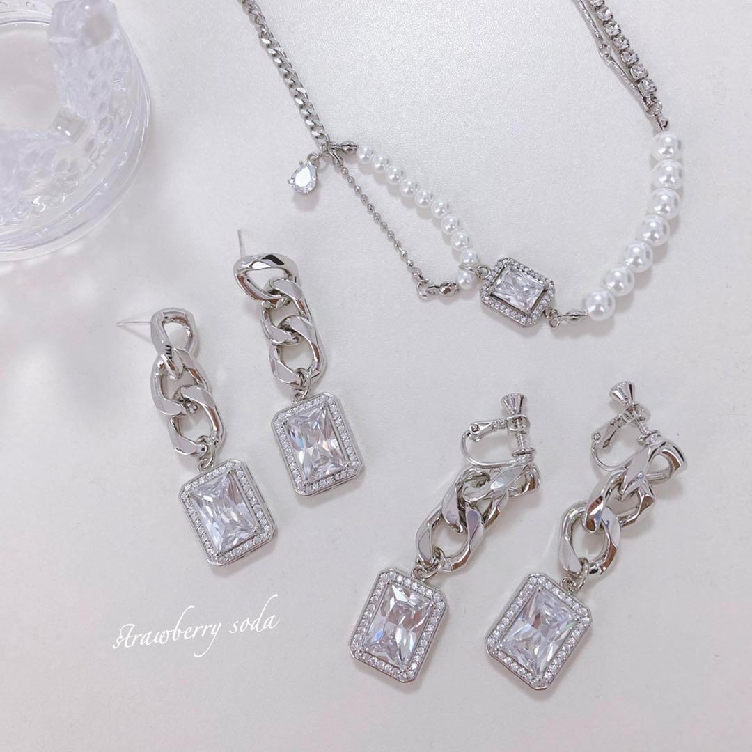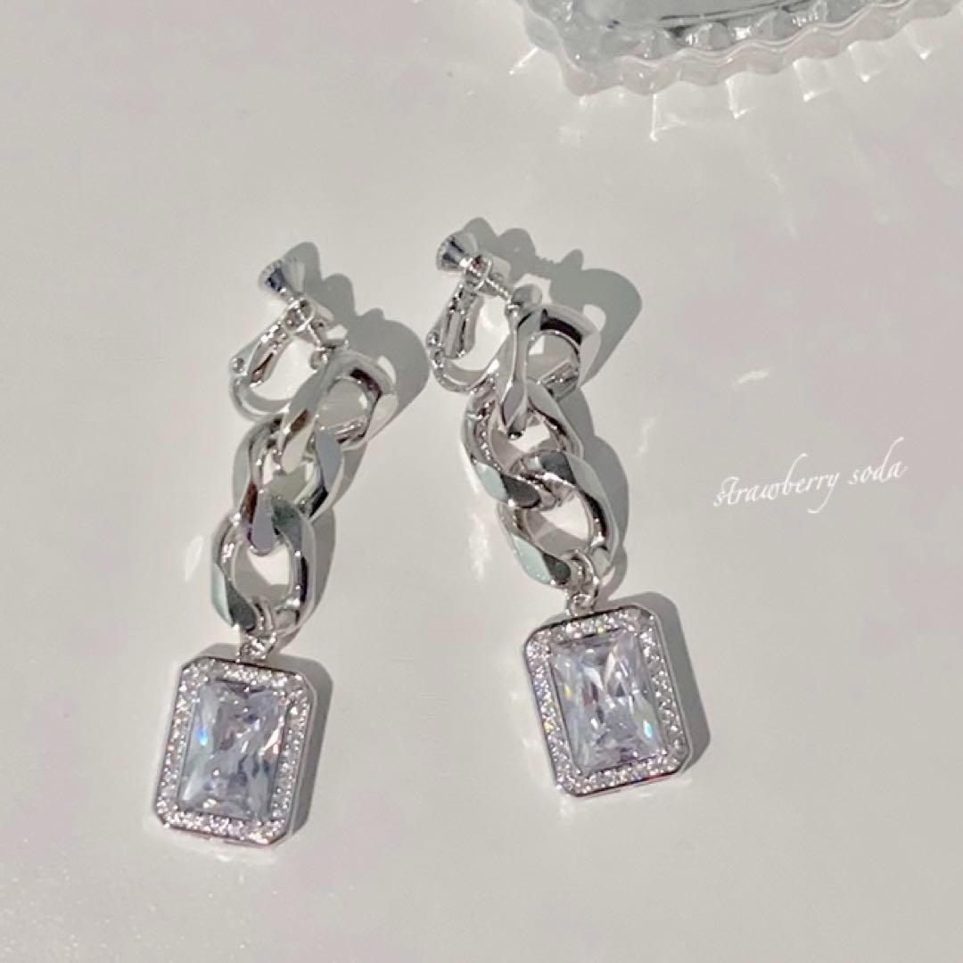 シルバー チェーン ラインストーン スクエアビジュー イヤリング サブカル 地雷 コスプレ コンカフェ 病みかわいい ゴスロリ 量産型 Y2K