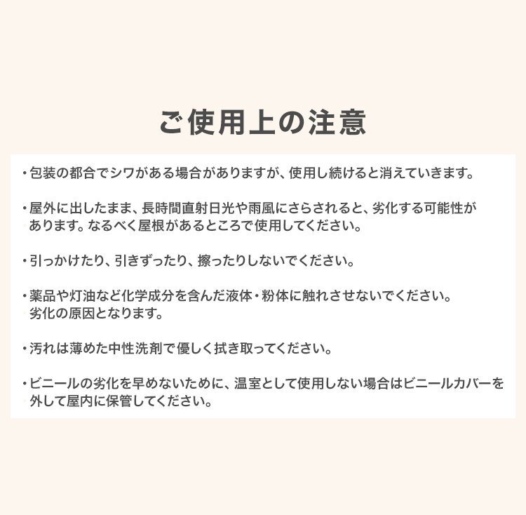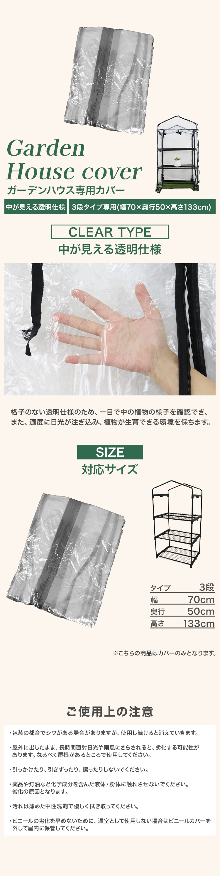 中がよく見える透明仕様です! また、適度に日光が注ぎこみ、植物が生育できる環境を保ちます。 ※こちらの商品はカバーのみの販売となります 【商品詳細】 サイズ:(約)幅70cm×奥行き50cm×高さ133cm 素材:ビニール 【注意事項】 ・商品はモニターによって色合いが異なって見える場合があります。 ・仕様/デザインは改良のため予告なく変更することがあります。 |