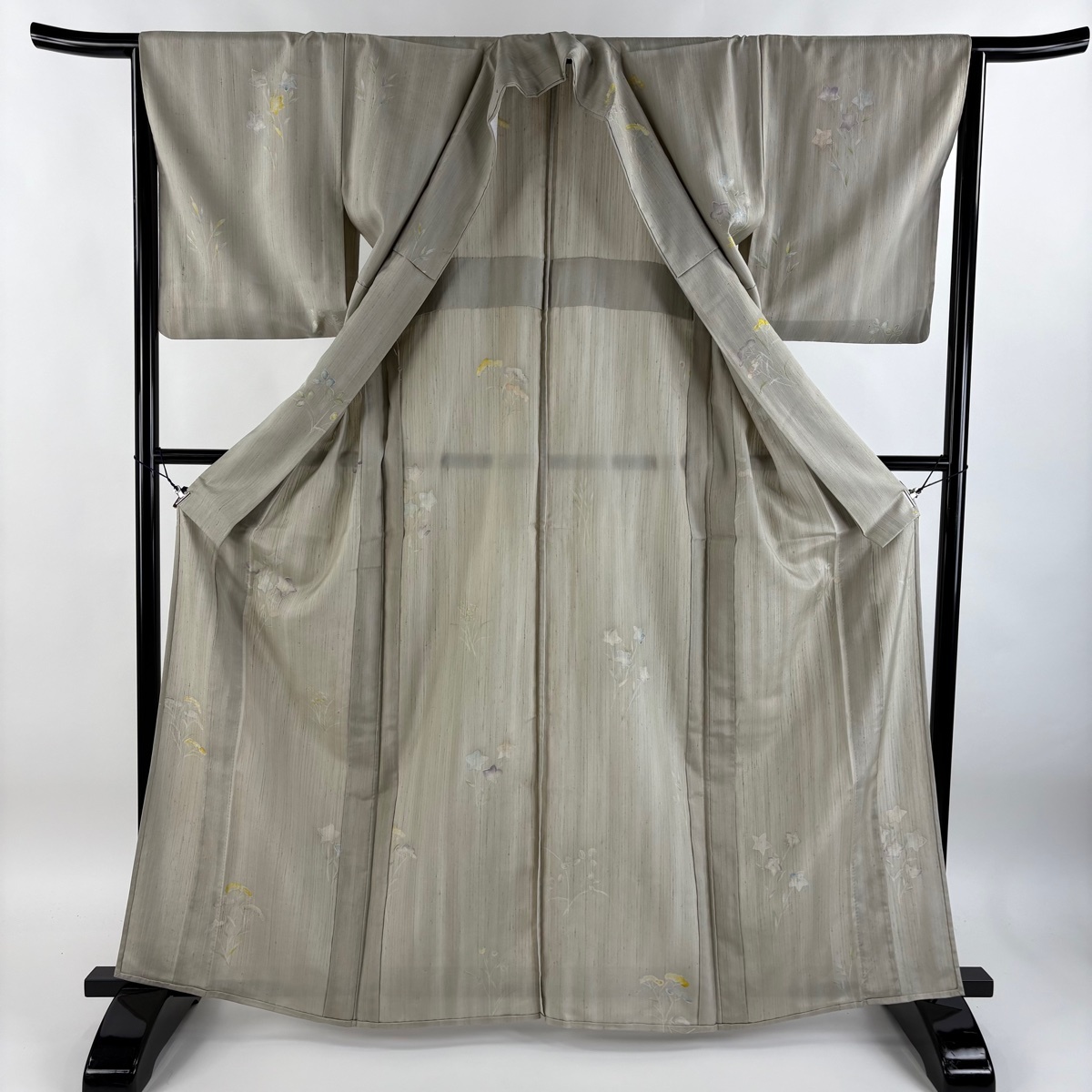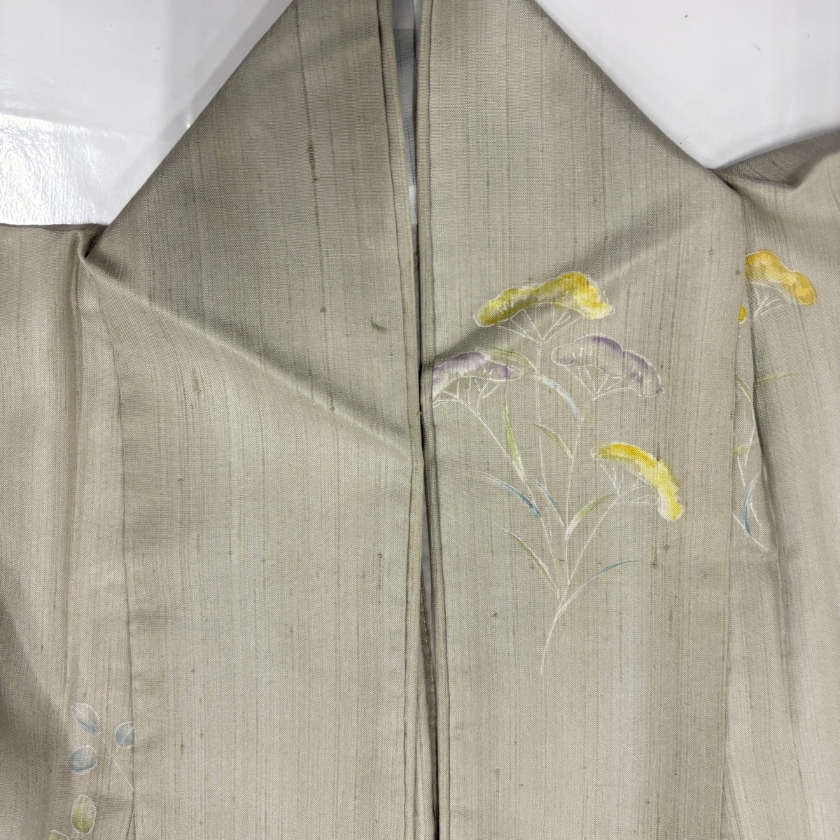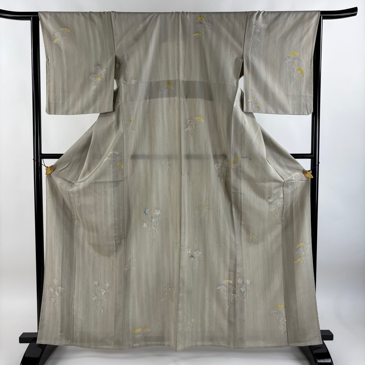 付下げ 秀品 紬地 縦縞 秋草 灰緑 単衣 身丈164.5 裄丈64.5 M 正絹 【中古】 |