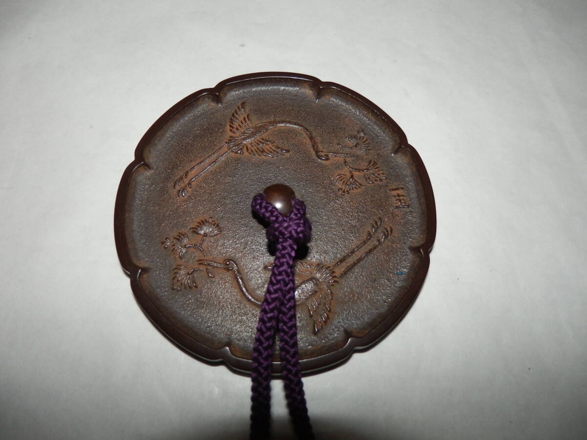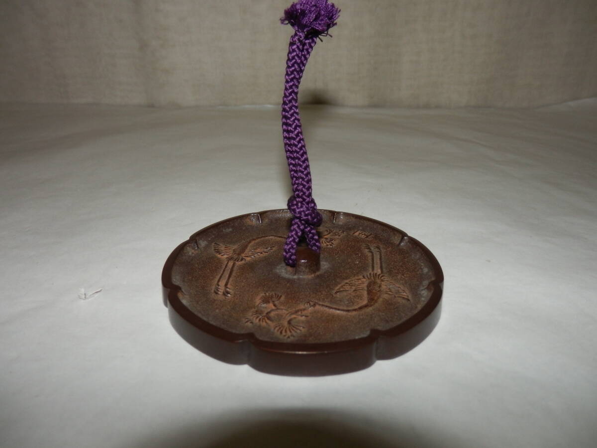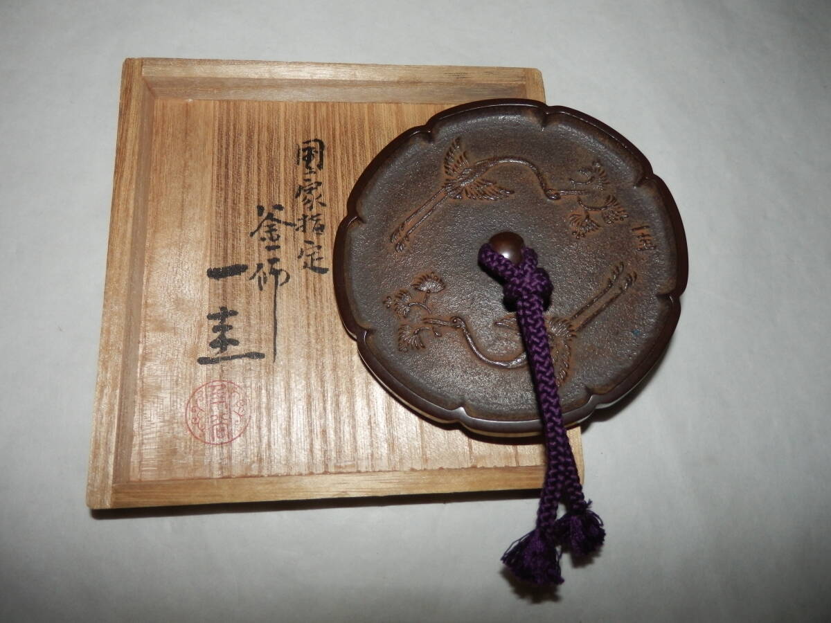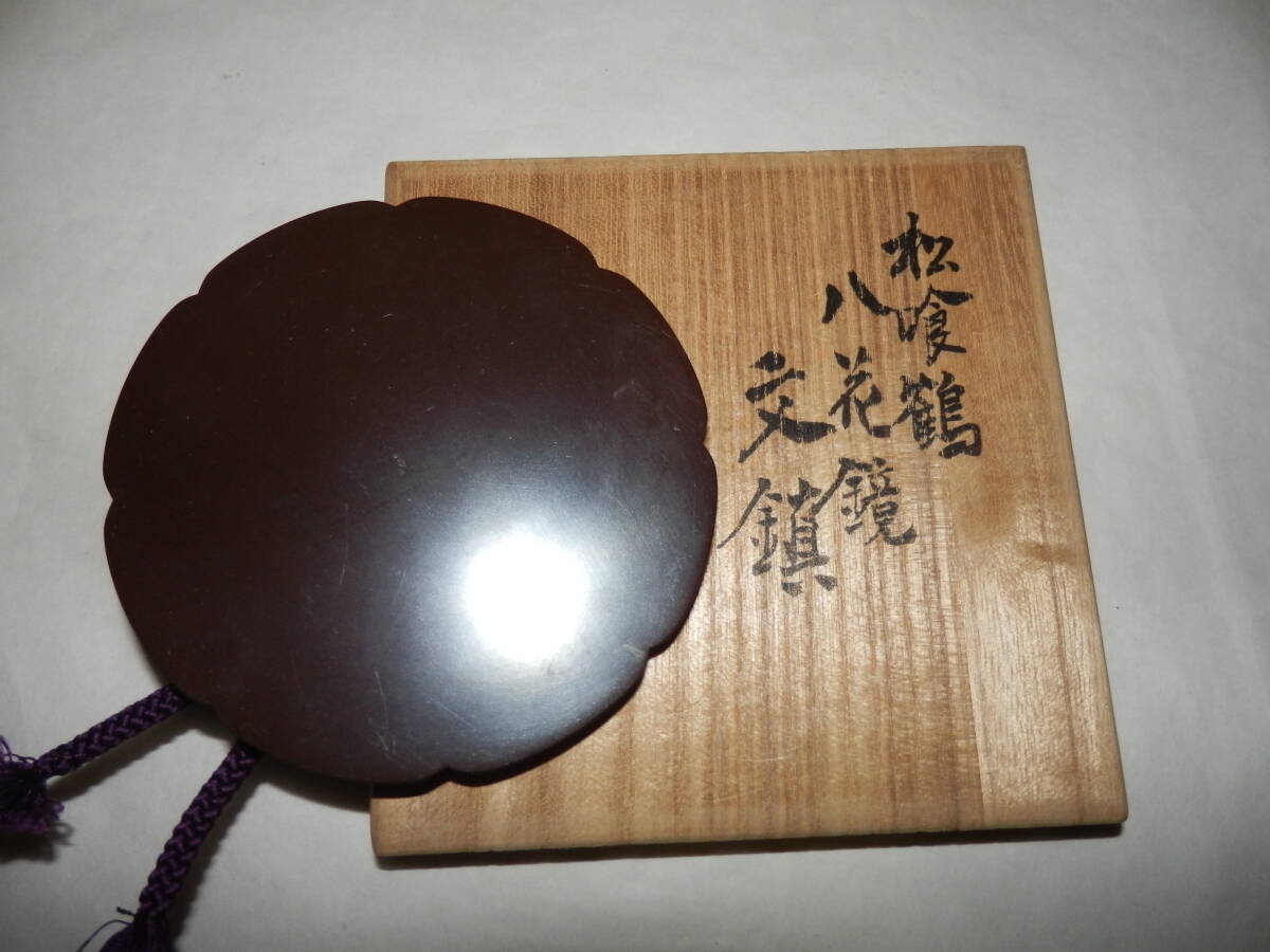 「書道具」 国家指定釜師{人間国宝}の角谷一圭さんの銅製の八花鏡の文鎮です。松喰鶴紋です。径約9.3cm 桐共箱「ヤケ、シミ等有」。どうぞ宜しく。