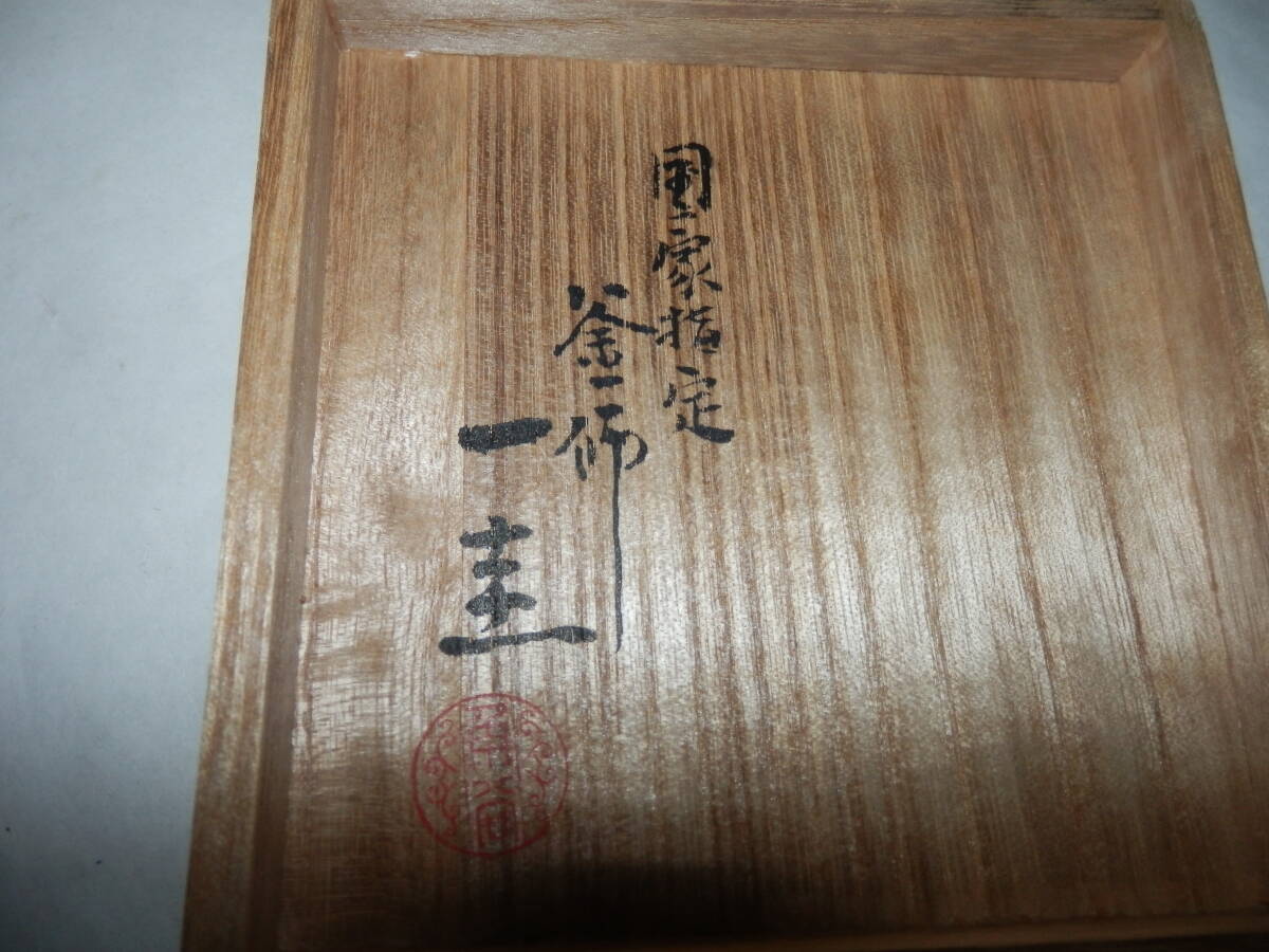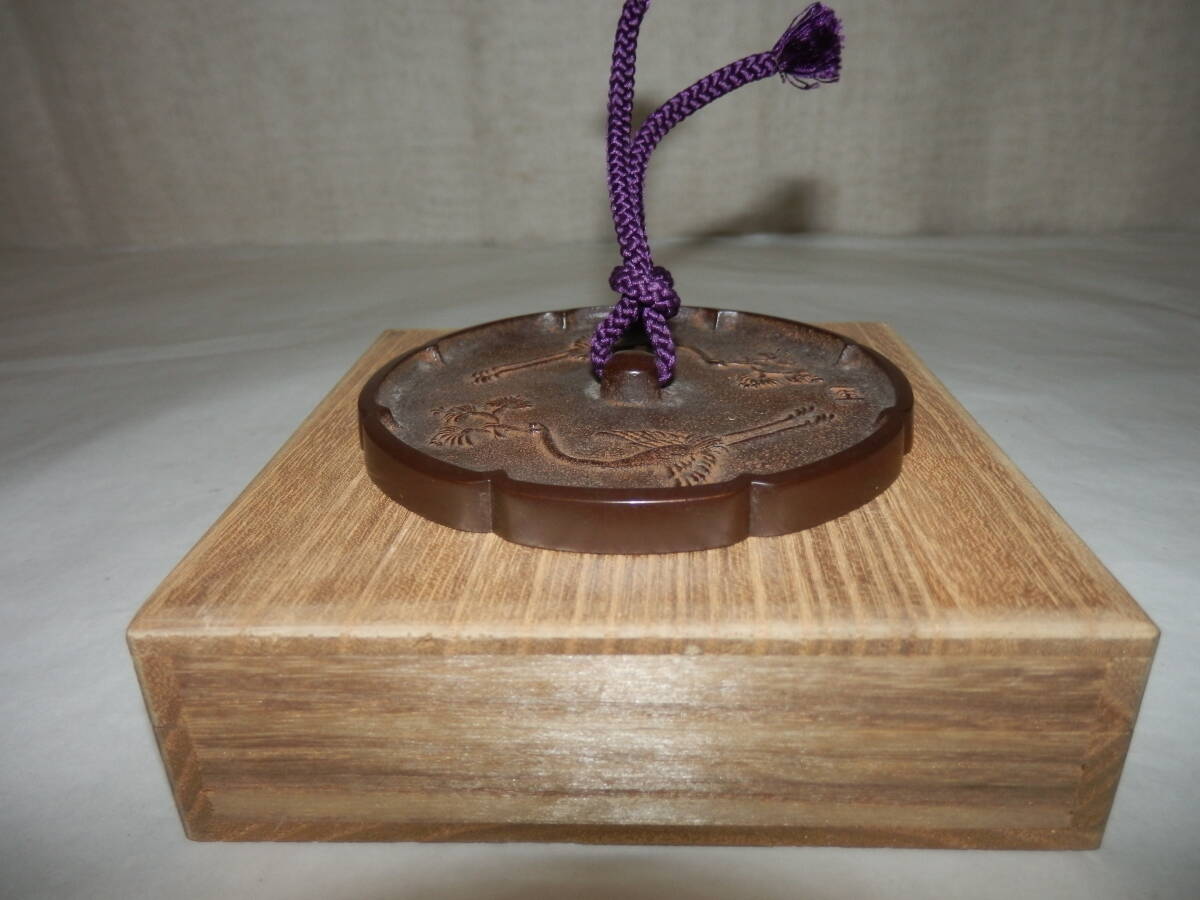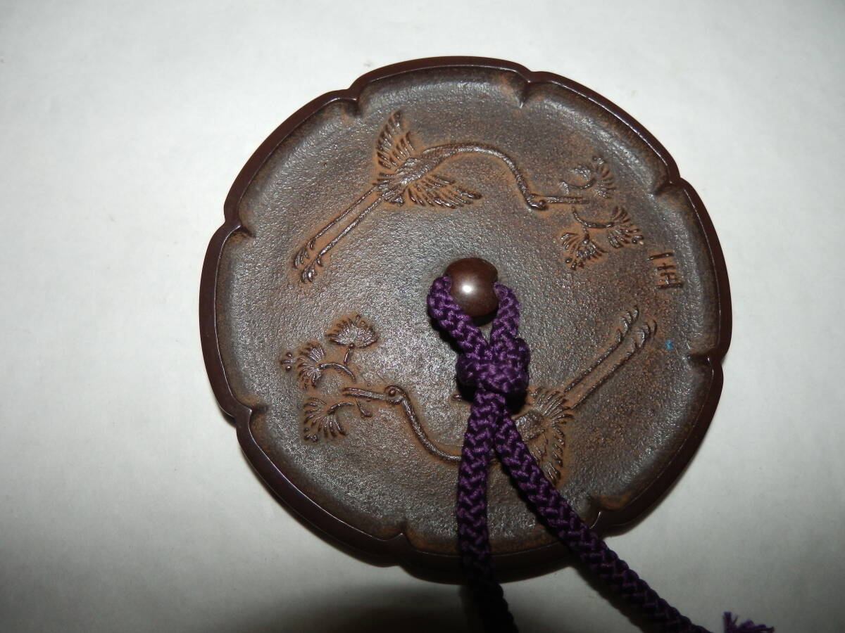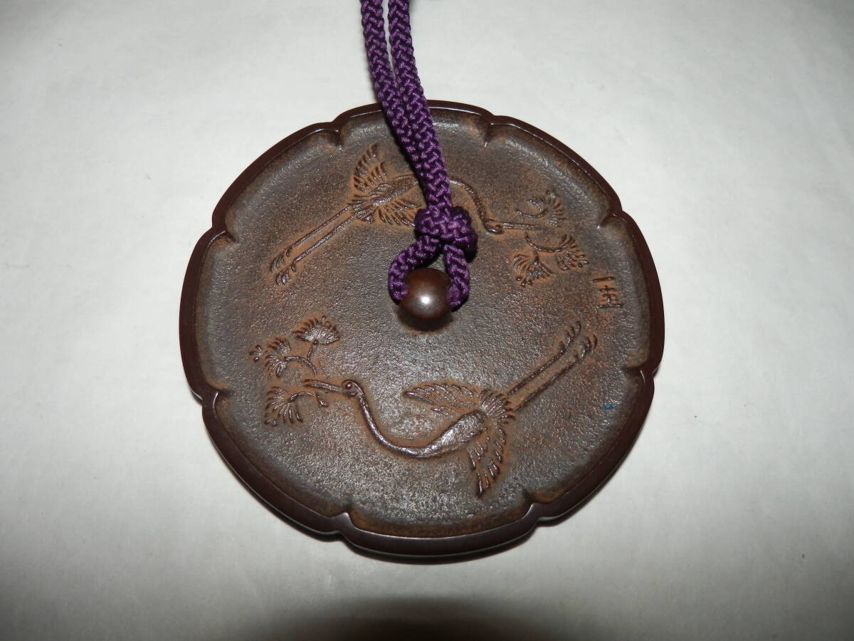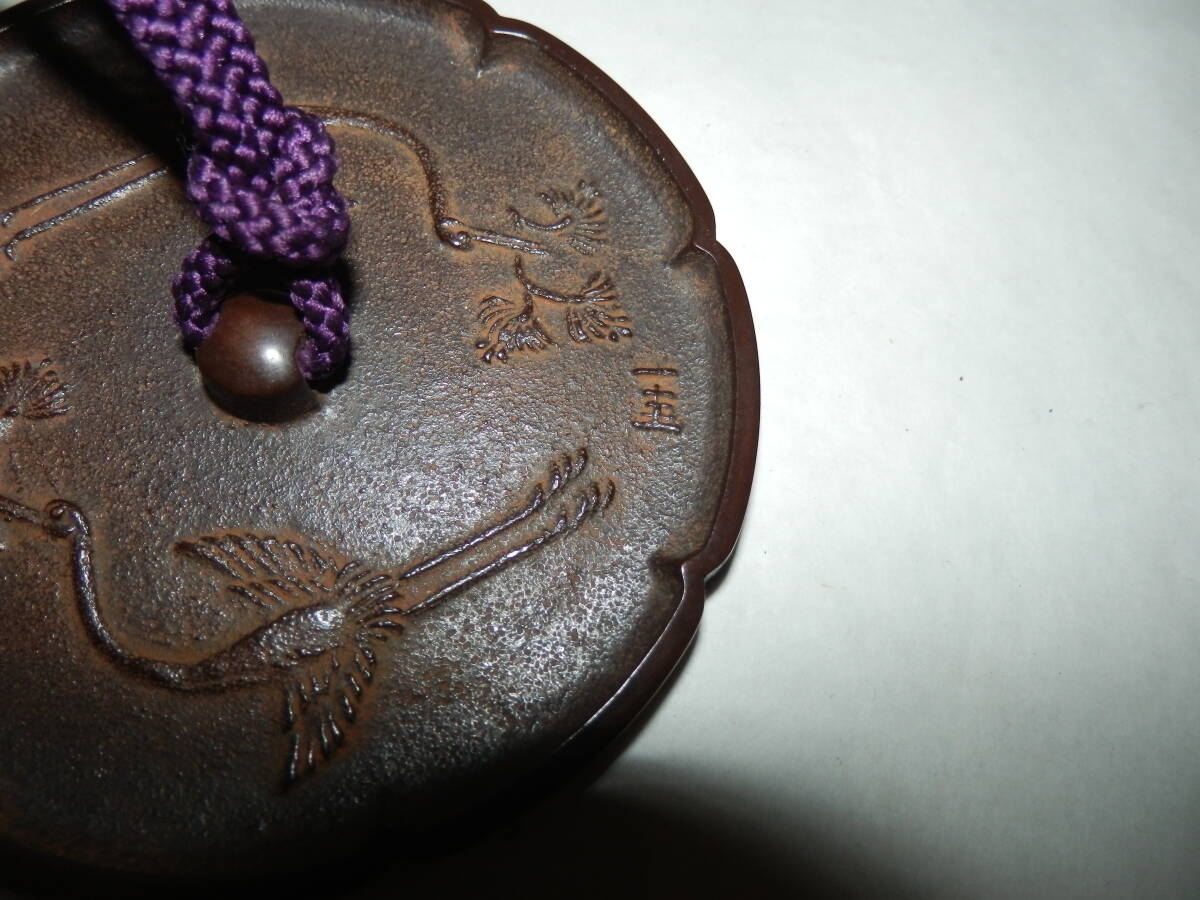 「書道具」 国家指定釜師{人間国宝}の角谷一圭さんの銅製の八花鏡の文鎮です。松喰鶴紋です。径約9.3cm 桐共箱「ヤケ、シミ等有」。どうぞ宜しく。