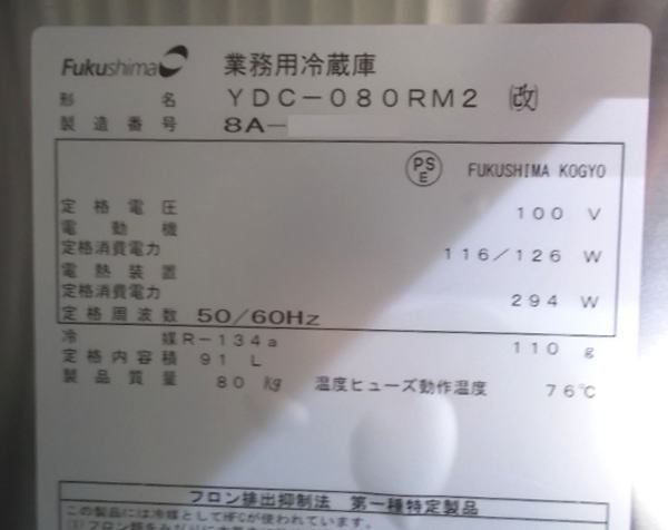 フクシマ ドロワー冷蔵庫 YDC-080RM2 750×600×800 中古厨房/25B1222Z