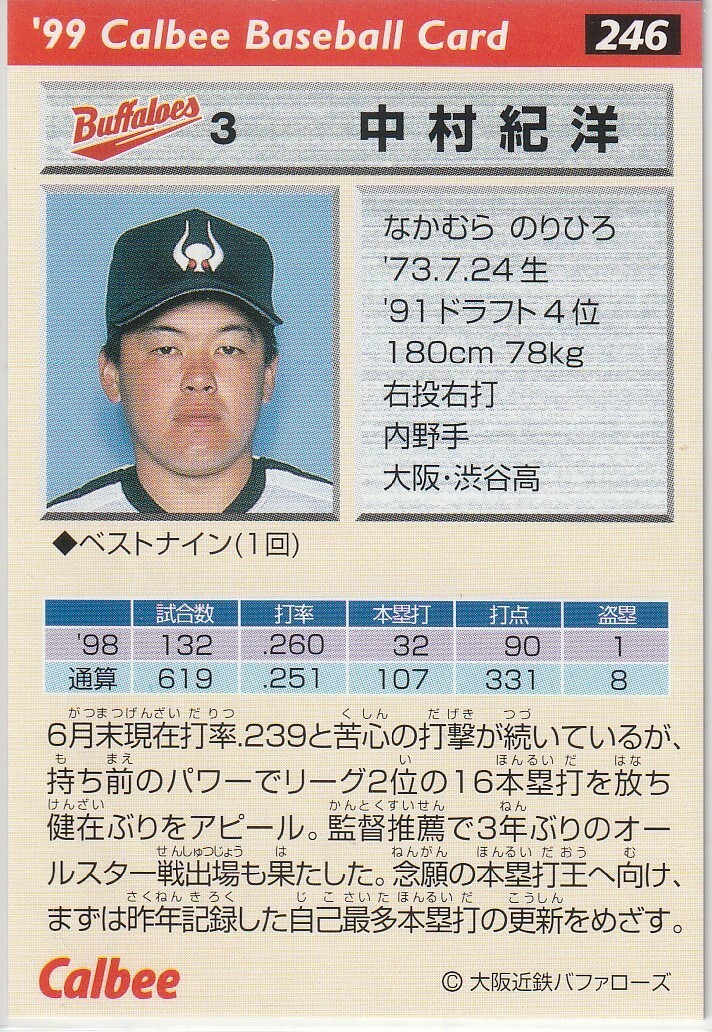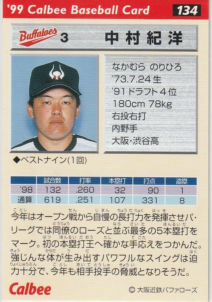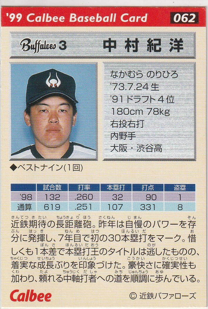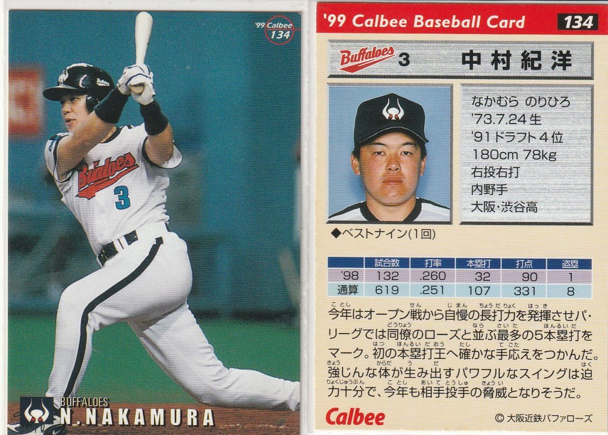 ●1999カルビー【中村 紀洋】レギュラーカード 2種セット No.062&134:近鉄
