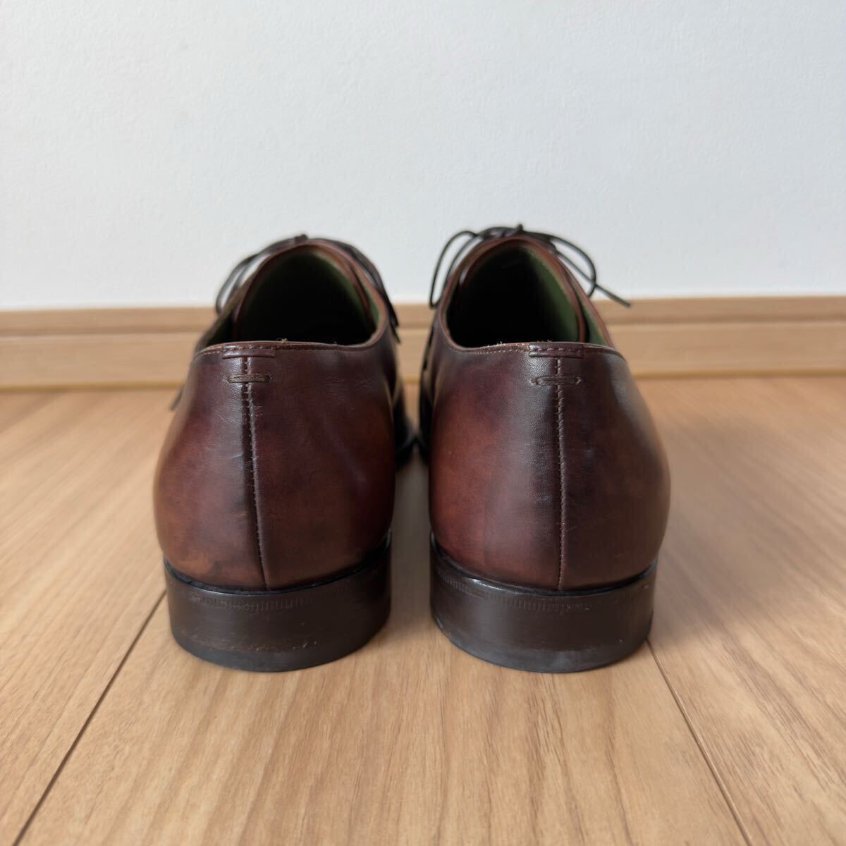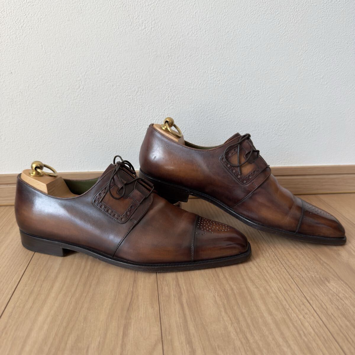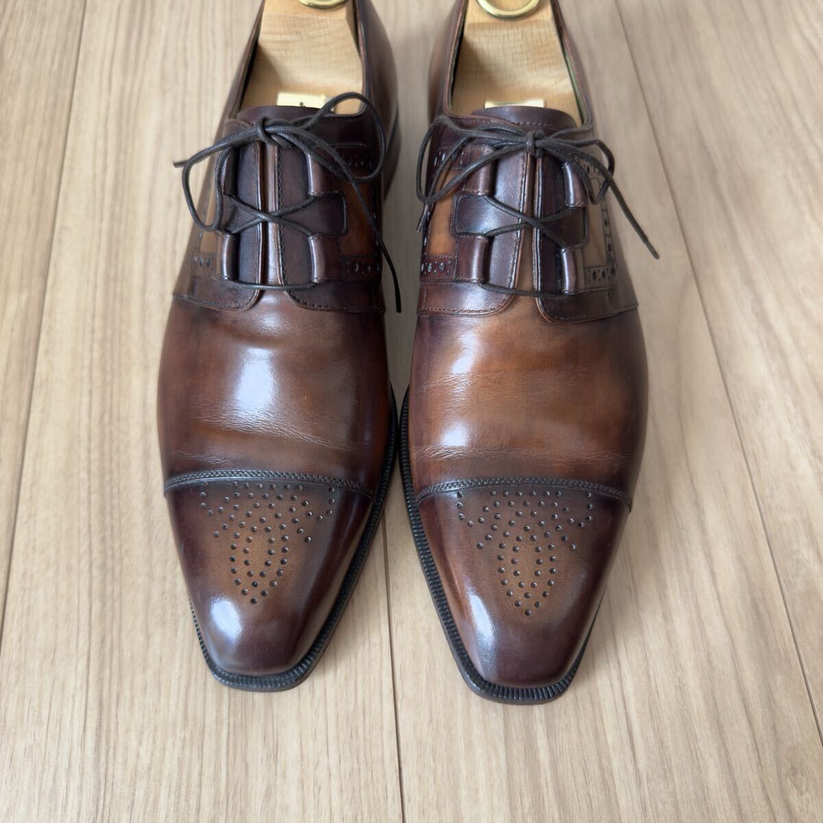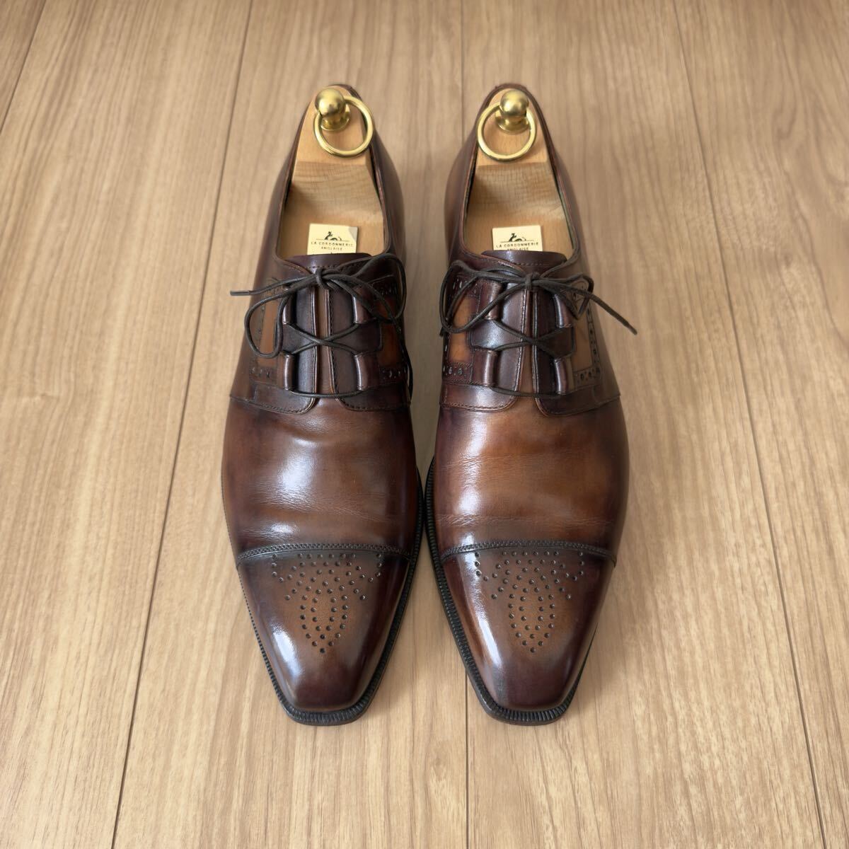 初期のベルルッティならではの端正ながら緻密に作り込まれた2アイレットダービーで、トゥにはブローギングを施したキャップトゥ。