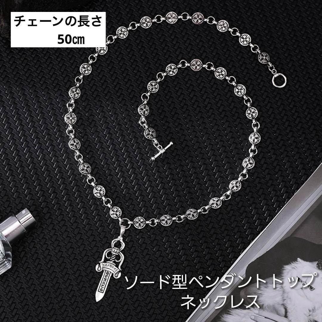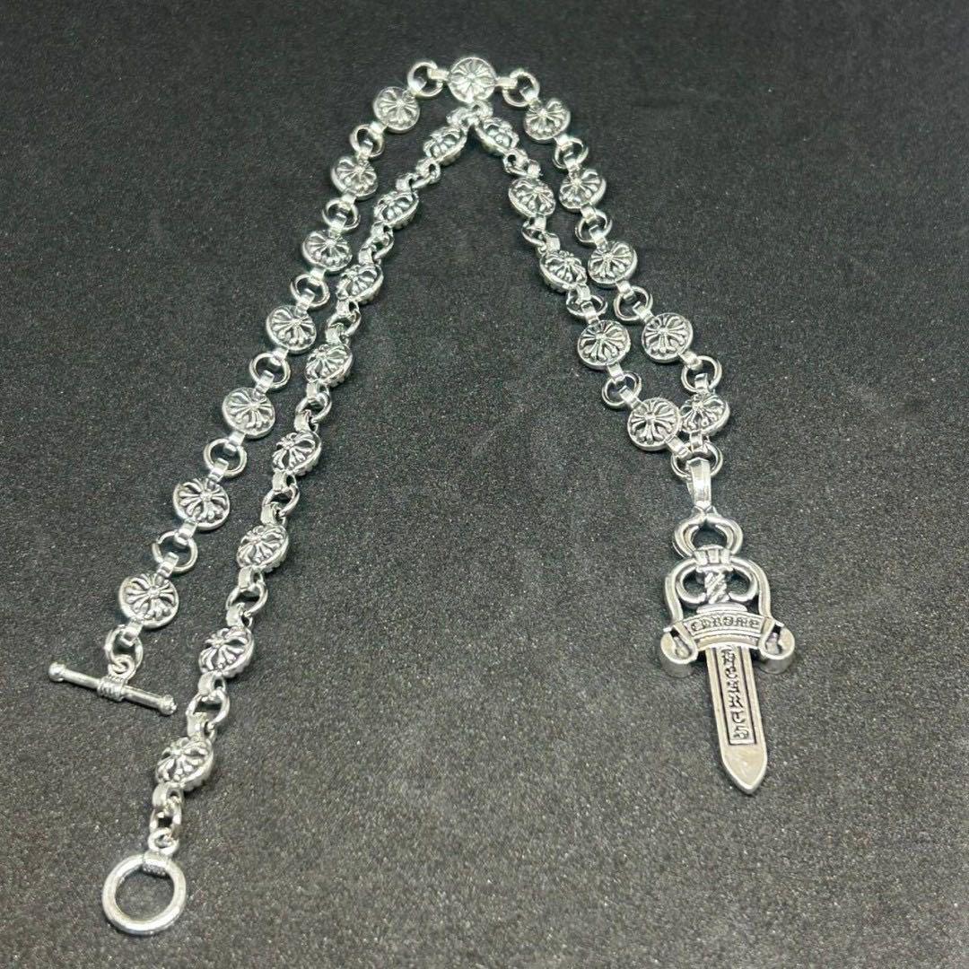 このネックレスは、円形の装飾が連なったチェーンで構成されており、ペンダントトップには美しい「細かいデザインが施された剣のチャーム」が付いています。