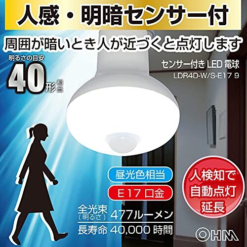 オーム(OHM) 電機 LED電球 レフランプ形 E17 40形相当 人感・明暗センサー付 昼光色 LDR4D-W/S-E17 9 06-341