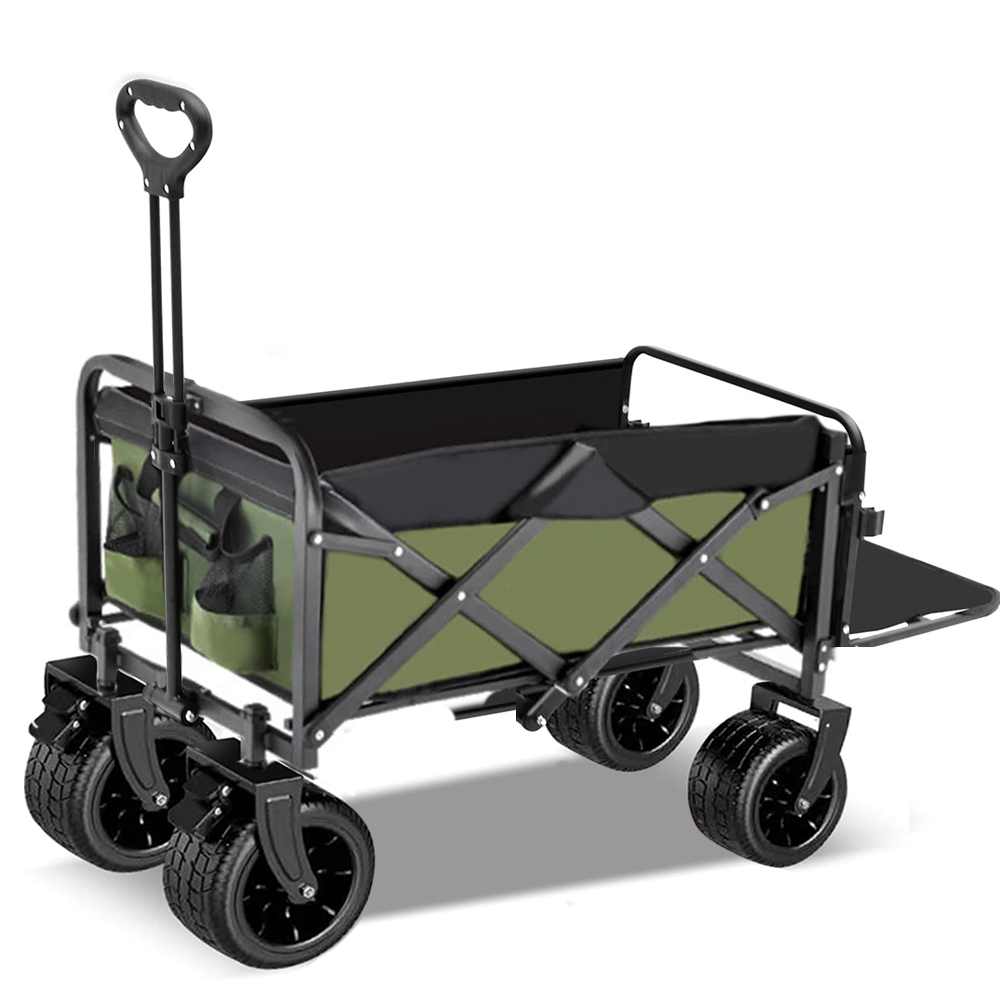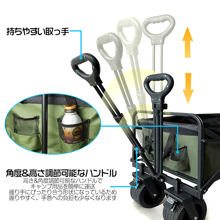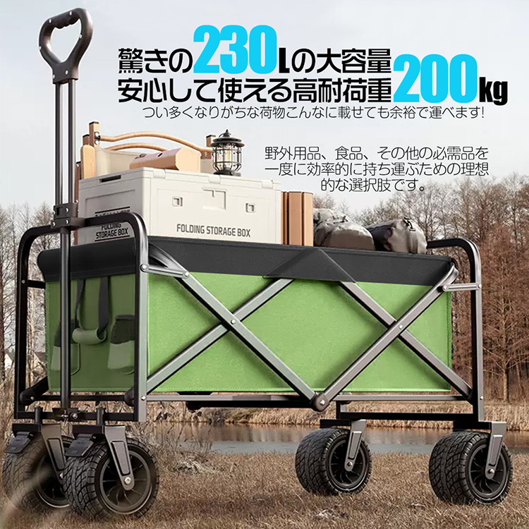 大型キャリーワゴン 大容量230L 後部展開可 ブレーキ付き 長物対応 折り畳み式 ワンタッチ収束 アウトドア 大型タイヤ オリーブグリーン@@