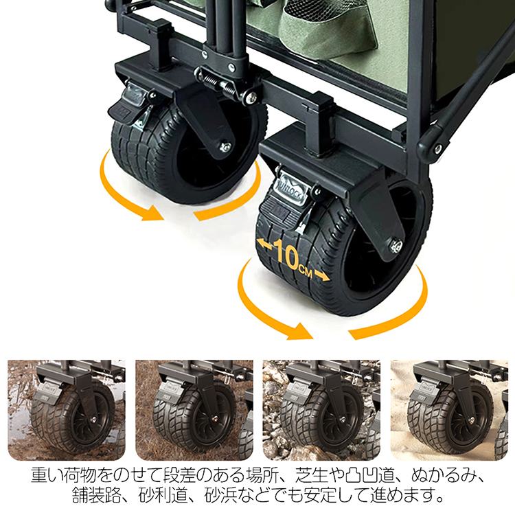 ●精良、車輪は柔軟、軽量で耐摩耗性タイヤ、様々な地形に対応しやすく、野外時により気軽に行動できます。