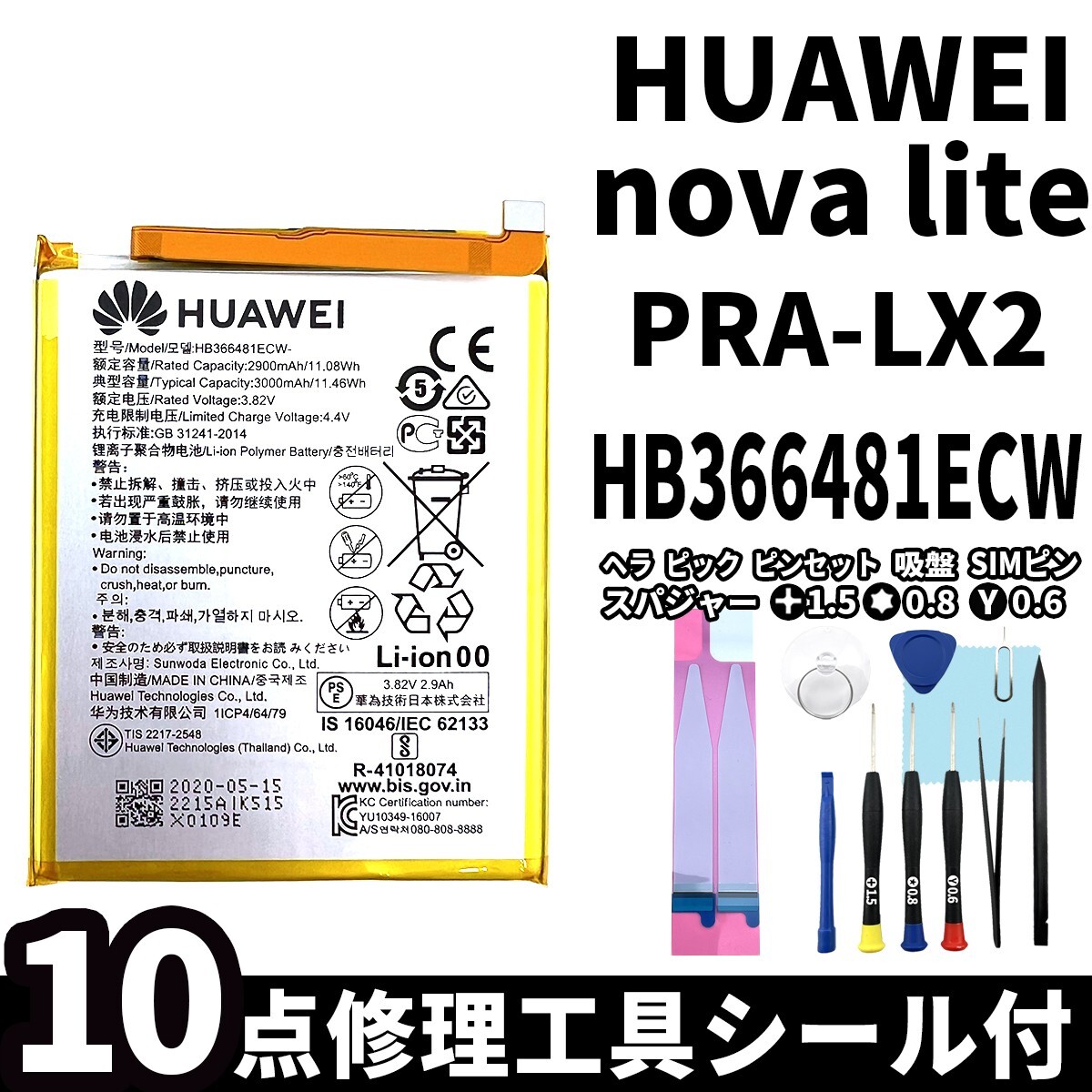 ★HUAWEI nova lite バッテリー交換 PRA-LX2 HB366481ECW 電池パック交換キット battery repair 電池交換専用両面テープ 修理工具付セット★