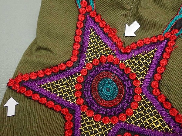 こちらの商品は中古品です。使用感があります。左ひざに色落ちがあります。 刺繍部分にひっかけやほつれがあります。その他、目立つ汚れやダメージなどは見られません。 | |